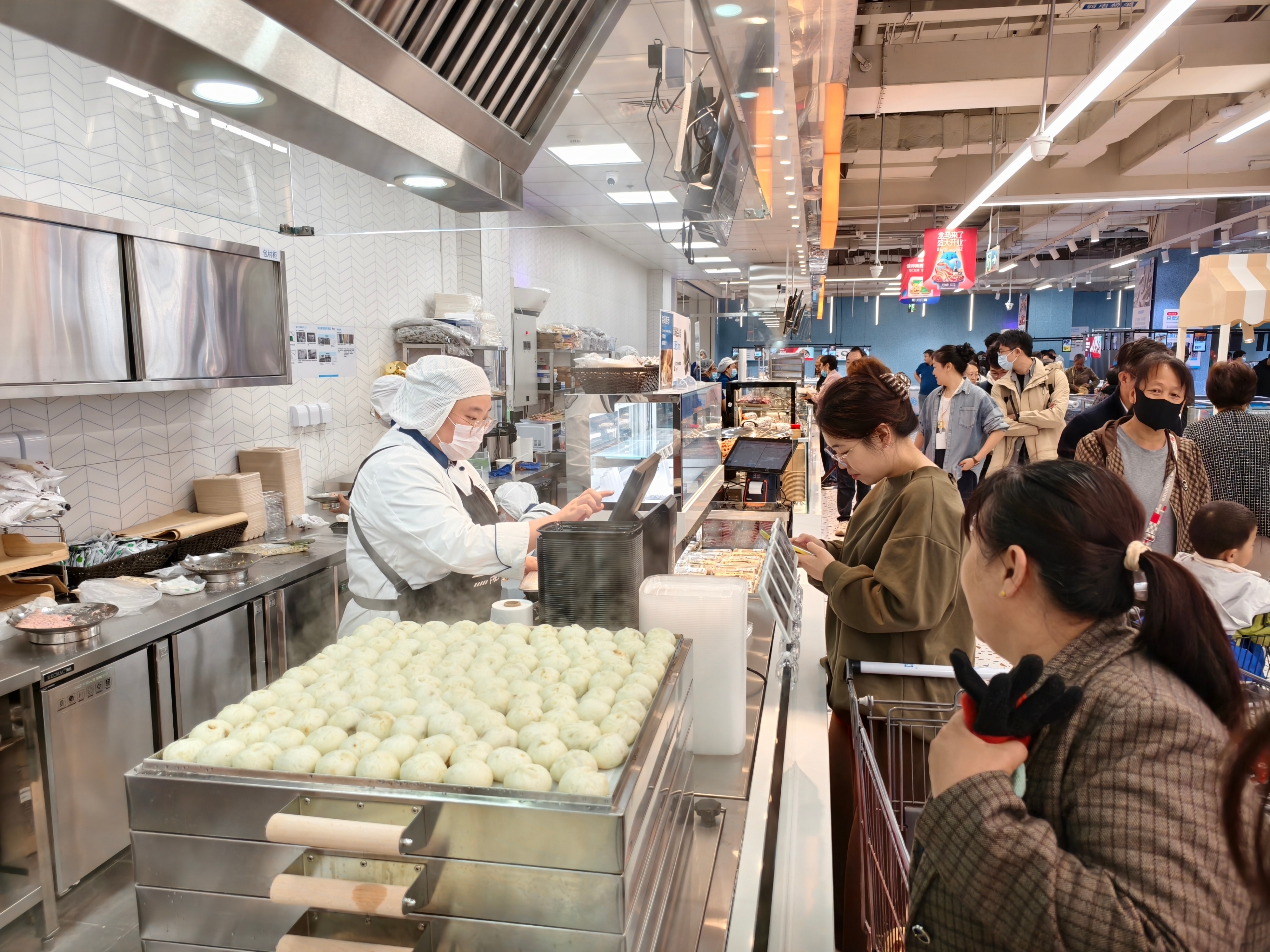 记者在现场看到,从清晨开门迎客起,顾客们便络绎不绝。鲜活水产区前,体型硕大的帝王蟹、波士顿龙虾成为焦点,许多顾客现场挑选后,便交由餐饮区进行“现捞现做”,在超市里品尝海鲜大餐的体验。烘焙区同样火爆,瑞士卷、榴莲千层、各类今年新品抹茶烘焙,吸引着年轻顾客;盒马花园的重瓣芍药、油画牡丹深受女性顾客欢迎。泰安盒马鲜生泰山吾悦广场店副店长黄旭东介绍,门店引入了各种鲜切肉类、时令蔬果、休闲零食等超过7000种商品,开业期间备货充足,以应对市民高涨的消费热情。