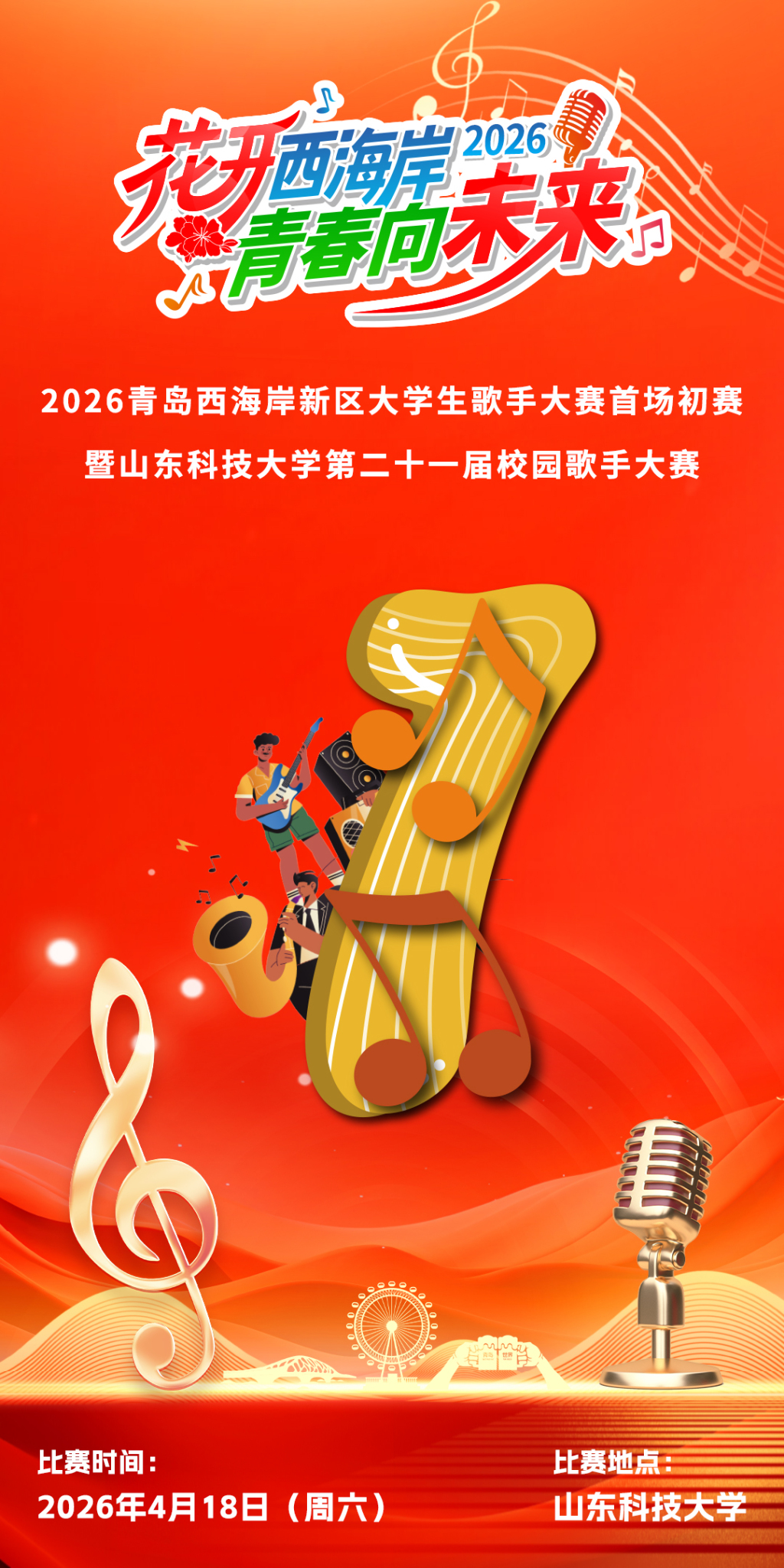 4月18日,“花开西海岸·青春向未来”2026青岛西海岸新区大学生歌手大赛首场初赛暨山东科技大学第二十一届校园歌手大赛将在山东科技大学繁星广场火热开唱。届时,来自该校的众多音乐才子才女将同台竞演,用歌声点燃春日校园,奏响属于新区的青春乐章。同时,此次赛事将通过大赛官方抖音号“‘声’动西海岸”进行全程直播,欢迎广大网友在线观看,并为喜欢的选手加油助威。