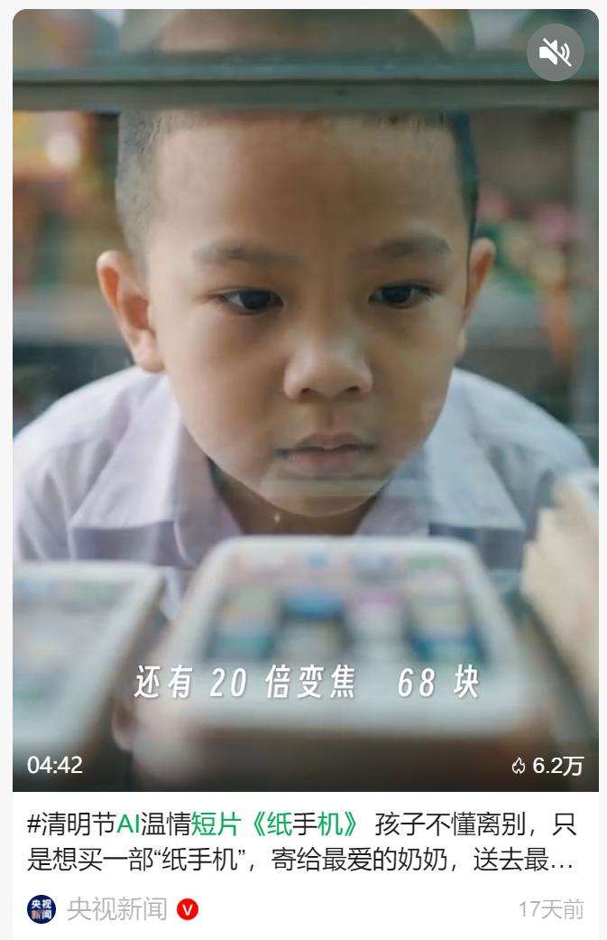 而清明档刷屏的AI短片《纸手机》,更是凭借AI技术赋能与真挚情感内核实现破圈传播。这部聚焦清明思念的短片,以失去双亲的小男孩购买纸手机、寄托对离世奶奶牵挂的朴素故事,细腻诠释中国式亲情与生死观,没有宏大叙事与华丽特效,却凭借极强的情感代入感与精致视听质感,上线后斩获全网超4000万播放量,获得权威媒体点赞转发,印证了AI技术与情感内容结合的强大生命力。