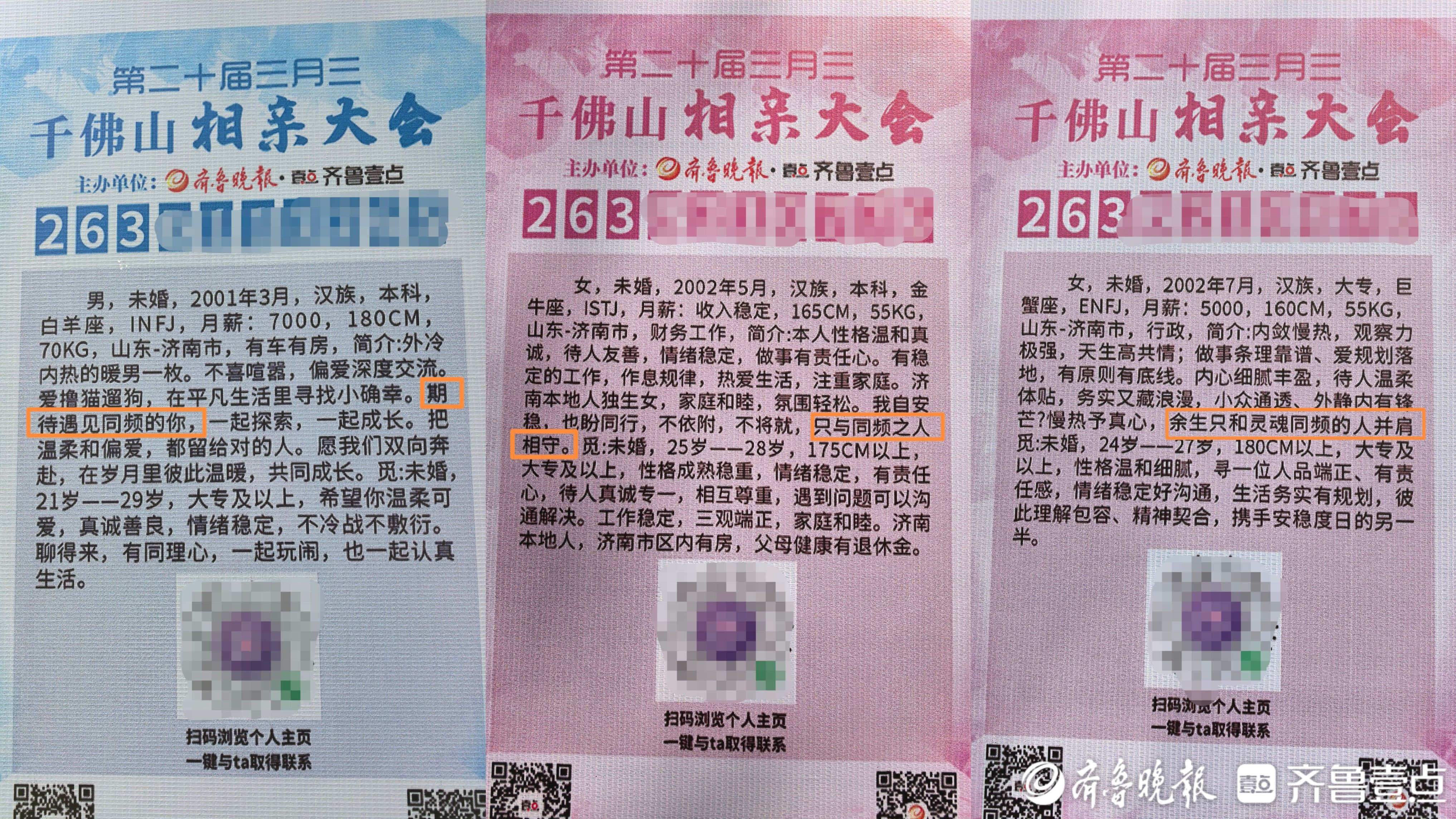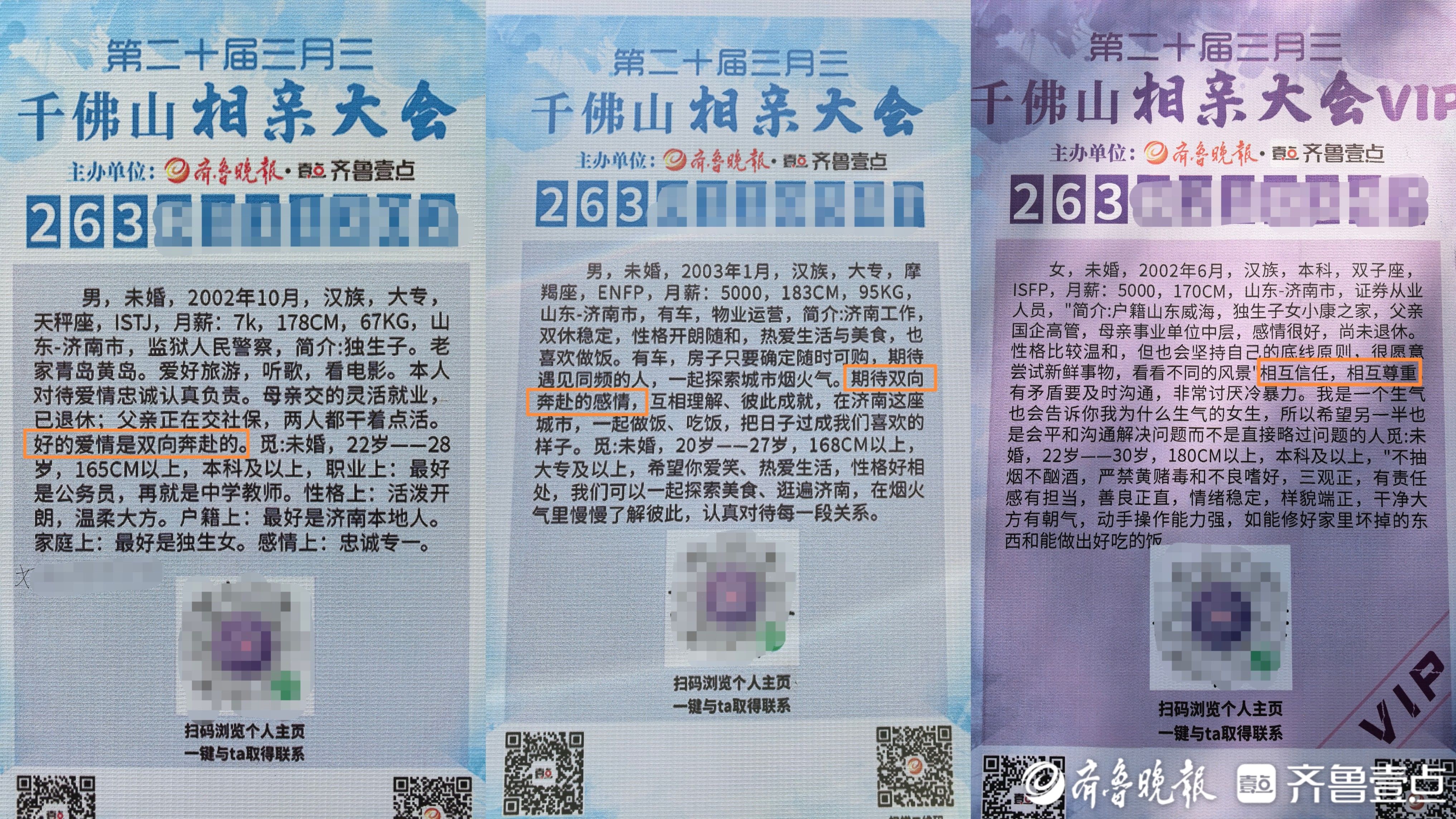 廿年不忘,爱有回响。 4月17日,由齐鲁晚报·齐鲁壹点主办的第20届三月三千佛山相亲大会在济南千佛山风景区东门内广场浪漫开幕。记者在现场注意到,本届相亲会上,随着第一批00后已迈入25岁+的门槛,越来越多的“Z世代”涌入这一传统相亲盛会中来,现场最小嘉宾出生于2005年。当“拒绝内卷”的00后开始涌入婚恋市场,他们对于找对象这件事有着怎样的新看法?对另一半又有着哪些不一样的择偶观?记者对此进行深度探访。