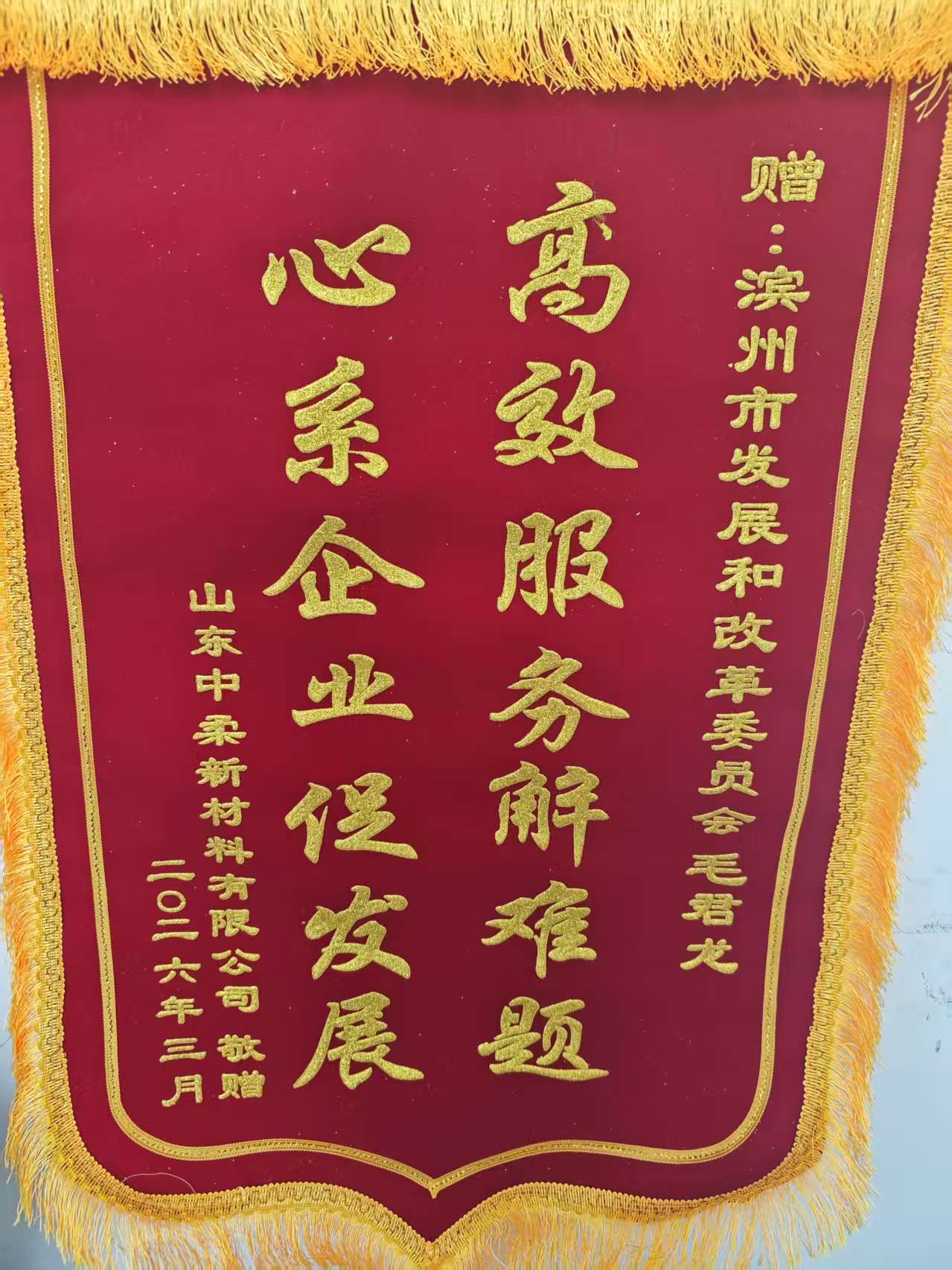 近日,一面印着“高效服务解难题,心系企业促发展”的锦旗被送到滨州市发展和改革委员会审批窗口,山东中柔新材料有限公司将这份满载感激的心意,交到了市发展改革委审批窗口负责人手中。这面鲜红的锦旗,不仅是企业对市发改委审批服务工作的高度认可,更是政企同心、共促发展的生动见证。