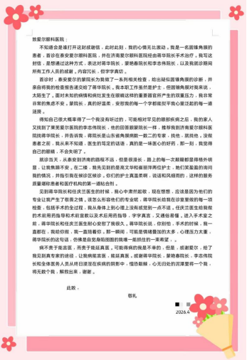 “感谢爱尔,给了我见到真专家的途径,让我病能言医,能延真医。感谢蒋华院长,蒙艳春院长,李志伟院长和全体医务人员从终日浸淫在疾病的阴影中,惶恐,心无归处的泥潭里将一个我,将无数个我,解救出来,谢谢。”李女士在感谢信中说道。