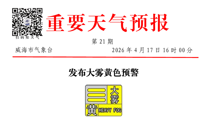 威海市气象台2026年4月17日16时00分发布大雾黄色预警