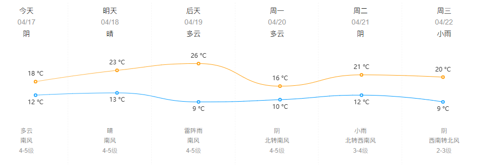 明天晚上到后天,晴转多云,有雾或轻雾,南风4~5级阵风6级,13℃~26℃;