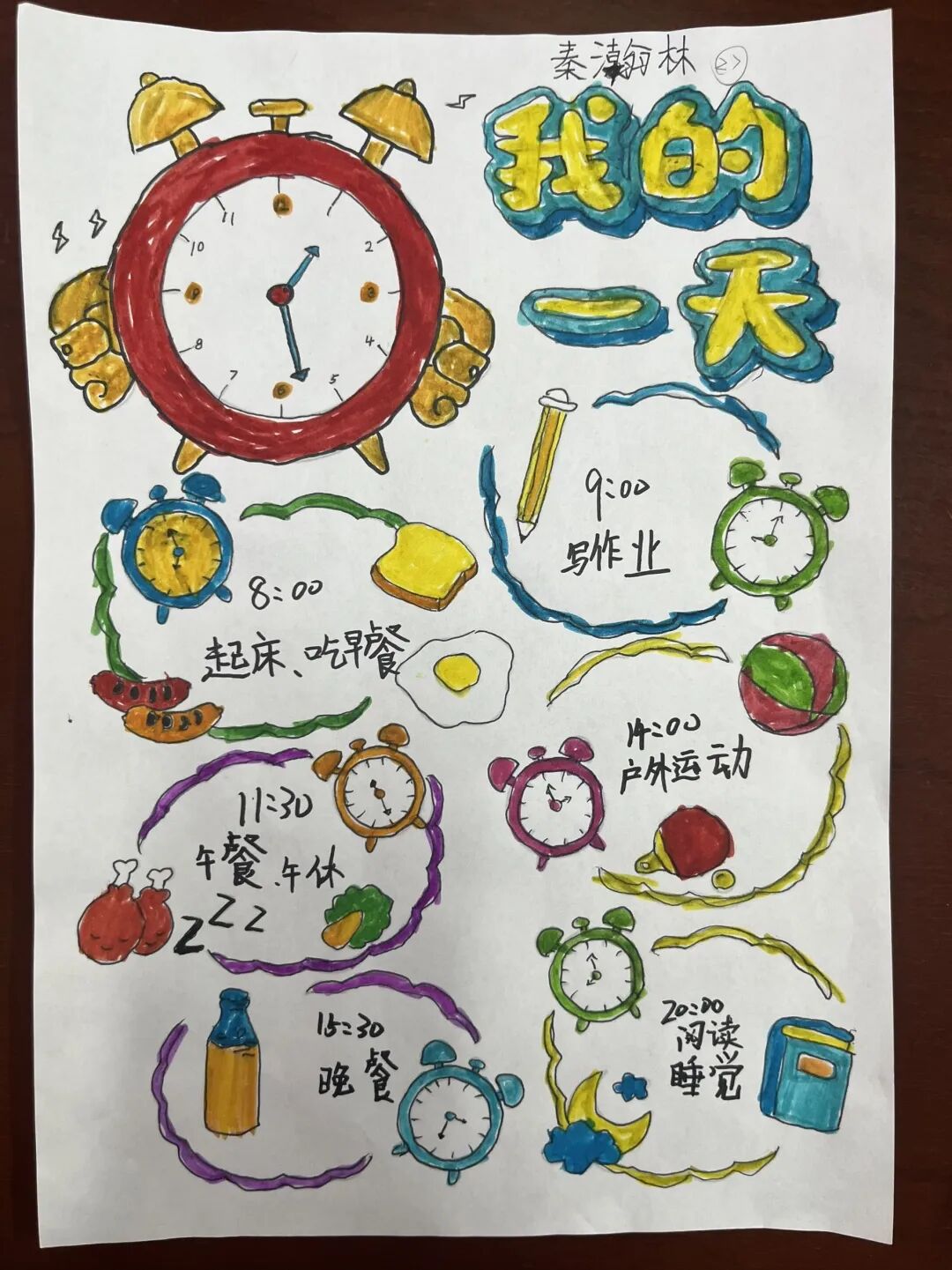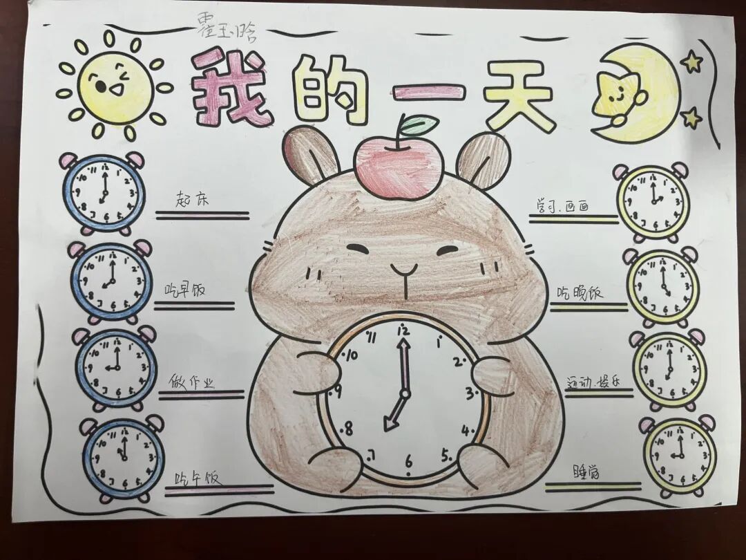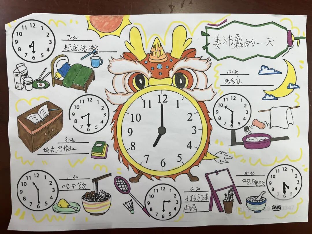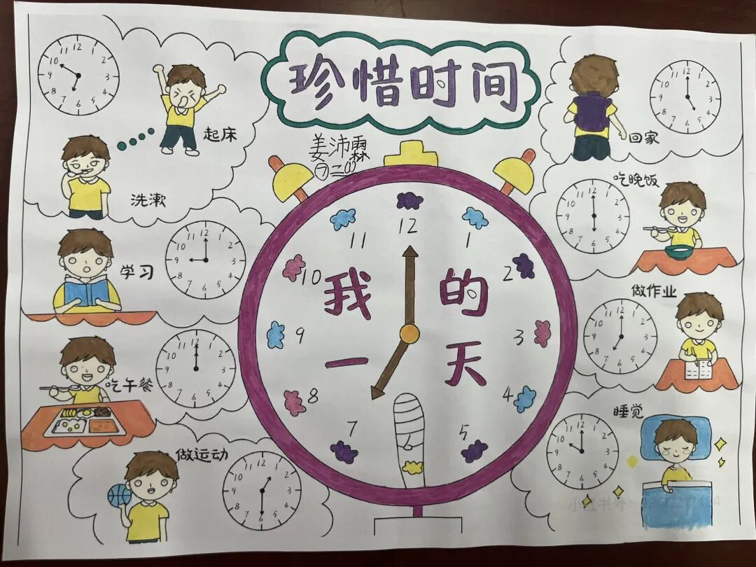 课堂上,教师系统讲解钟表认读、时间换算等基础知识,帮助学生扎实掌握核心内容。课堂之外,学生化身小小设计师,将所学知识融入创意创作,精心制作《我的一天》时间小书,详细记录起床、学习、运动、休息等日常时刻,用图画搭配文字标注对应时间,清晰梳理一日作息,在创作中熟练运用时间知识,学会规划生活。