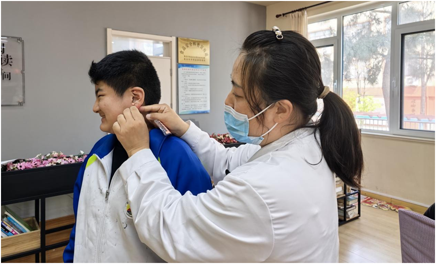讲座结束后,5名中医医师为学生们进行免费耳穴贴敷,严格按照规范选取眼、目、肝等穴位操作。轻柔按压,酸胀舒适,深受孩子们喜爱。首场活动就为290名学生提供了贴心服务,不少同学兴奋地说:“耳朵上贴个小豆豆,眼睛真的舒服多了!”
