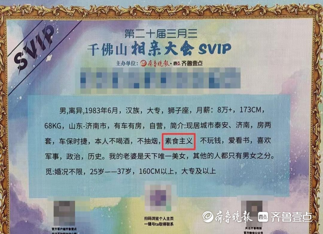 一位1983年出生的男嘉宾在个人简介中这样写道:“现居城市泰安、济南,本人不喝酒,不抽烟,素食主义,不玩钱,爱看书,喜欢军事,政治,历史。”在这段介绍中,“素食主义”与“不抽烟、不喝酒”并列,成为他自我描述中一个重要的标签。