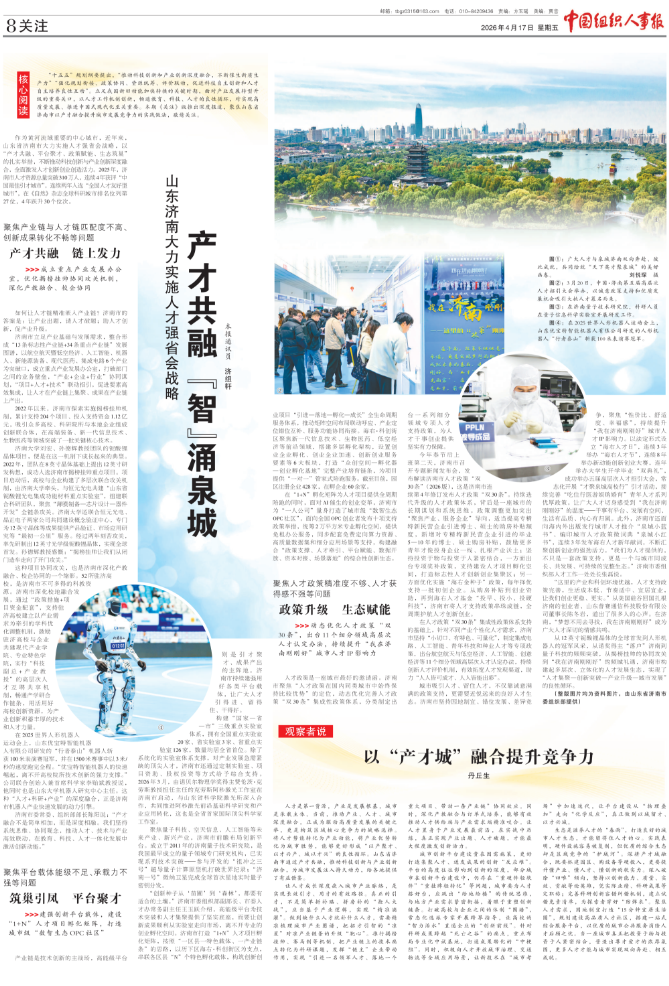4月17日,《中国组织人事报》推出深度报道,以《山东济南大力实施人才强省会战略 产才共融 “智”涌泉城》为题,整版聚焦山东省济南市以产才融合提升城市发展竞争力的实践做法,敬请关注。