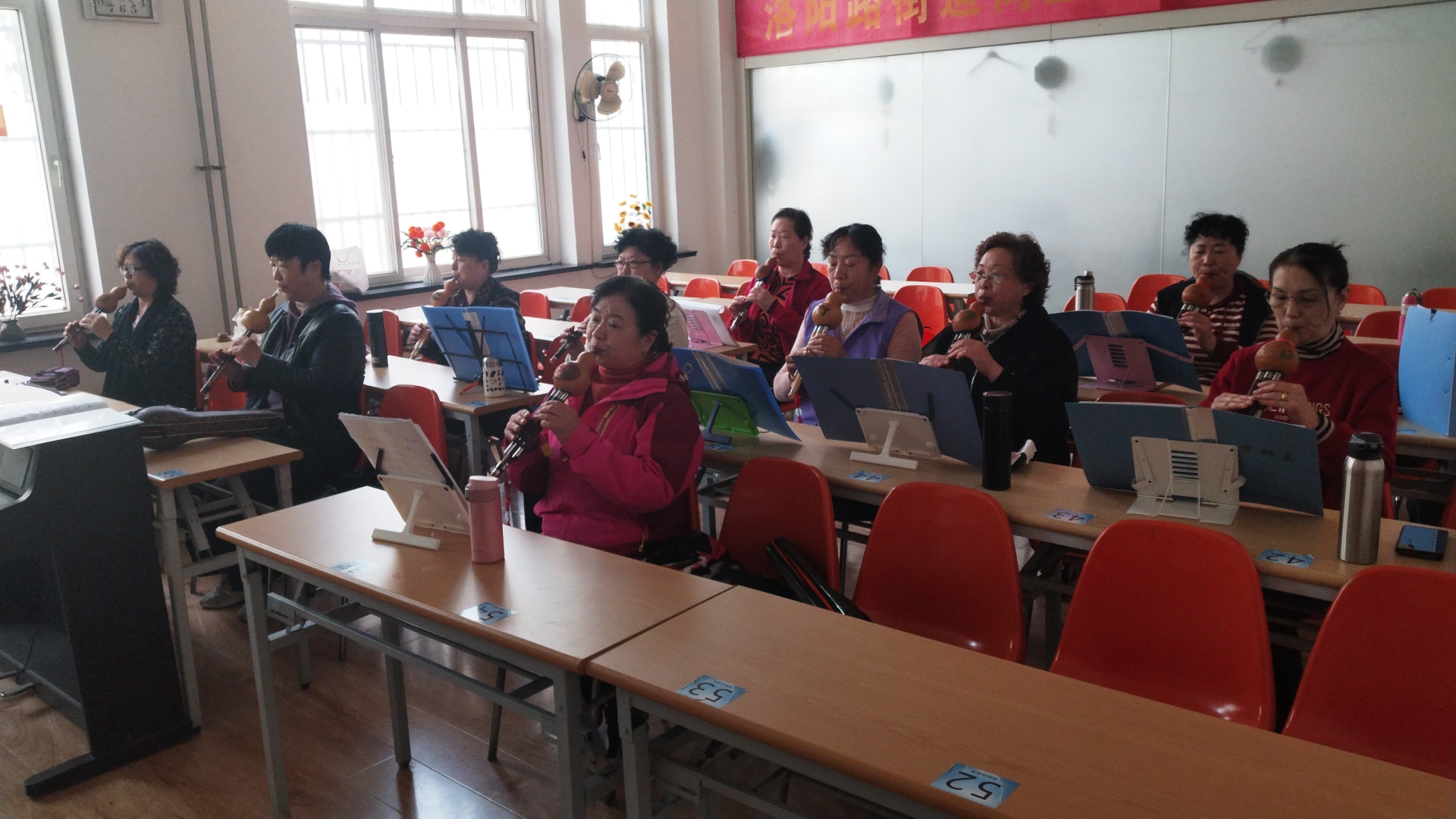 第一组队员专注打磨《映山红》,从低沉婉转的开篇到激昂高亢的高潮,反复校准音准、调整节奏、打磨气息,力求将歌曲中对革命先烈的深切缅怀、对红色岁月的深情追忆、对美好生活的热切向往完美呈现,每一个音符都饱含赤诚。第二组队员则以铿锵有力的节奏奏响《没有共产党就没有新中国》,大家齐心协力校准节奏、统一音色,用葫芦丝特有的醇厚音色,传递着新时代老年人对党的赤诚热爱与无限感恩,彰显了文化社区的红色底色。