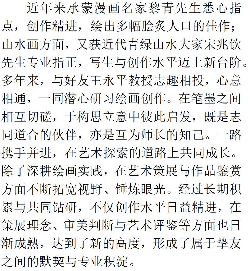 作为当代画坛的中坚力量,吴伟始终坚守创作初心,以笔为刃、以墨为魂,在漫画与水墨的双重领域深耕不辍。他用作品回应时代,用艺术传递温度,既展现了当代画家的责任与担当,也彰显了中国传统艺术与现代审美融合的无限可能。未来,相信这位以心作画的艺术家,将继续在艺术之路上步履不停,以更具新意的创作、更富内涵的作品,为当代画坛添上浓墨重彩的一笔,让更多人在笔墨之间感受艺术的魅力、体悟生活的美好。