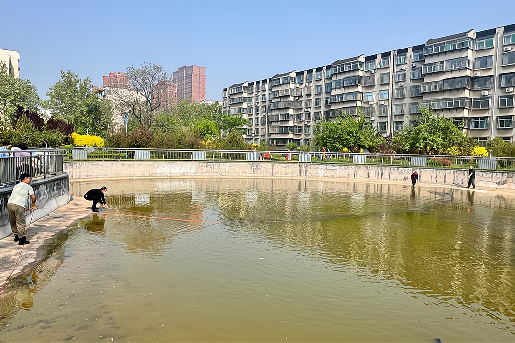 4月17日上午,一场针对性的“擒鱼行动”正式展开。社区居委会专门借来20米长的专业渔网,工作人员换上水鞋、戴好防护手套,踏入水池中。大家分工协作,两人一组分别从水池南北两侧站位,同步由东向西缓慢拖拽渔网,步步为营缩小围捕范围。经过20多分钟的齐心协力、紧密配合,这条潜藏在水池中的“不速之客”终于被成功捕获。