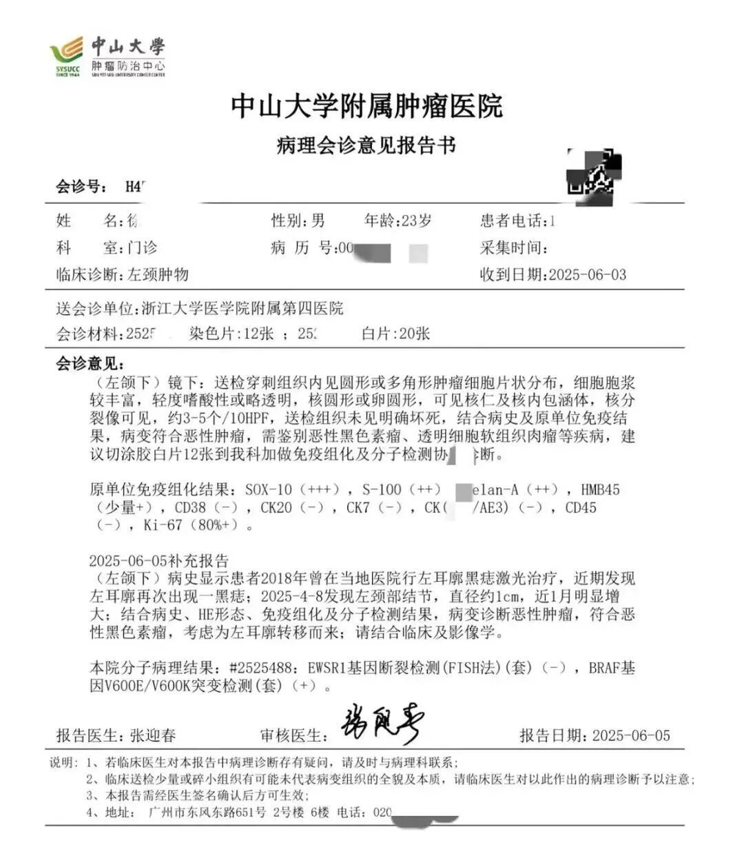 徐平安曾多次复盘自己确诊前被忽略的身体信号。他写道:2018年,耳朵边出现一颗边缘不规则、与周围皮肤分界模糊的黑痣,且一直在慢慢变大。当时他没在意,去小医院用激光打掉了。直到2025年4月,他发现脖子上出现淋巴结肿大,起初只有花生米大小,观察两天后有变大的趋势,便到三甲医院检查。抽血化验没问题,医生判断只是普通淋巴结肿大,建议再观察。两个月后,淋巴结再次变大,怀疑是肿瘤。穿刺化验后,2025年6月正式确诊为恶性黑色素瘤,CT结果显示骨转移已是晚期。