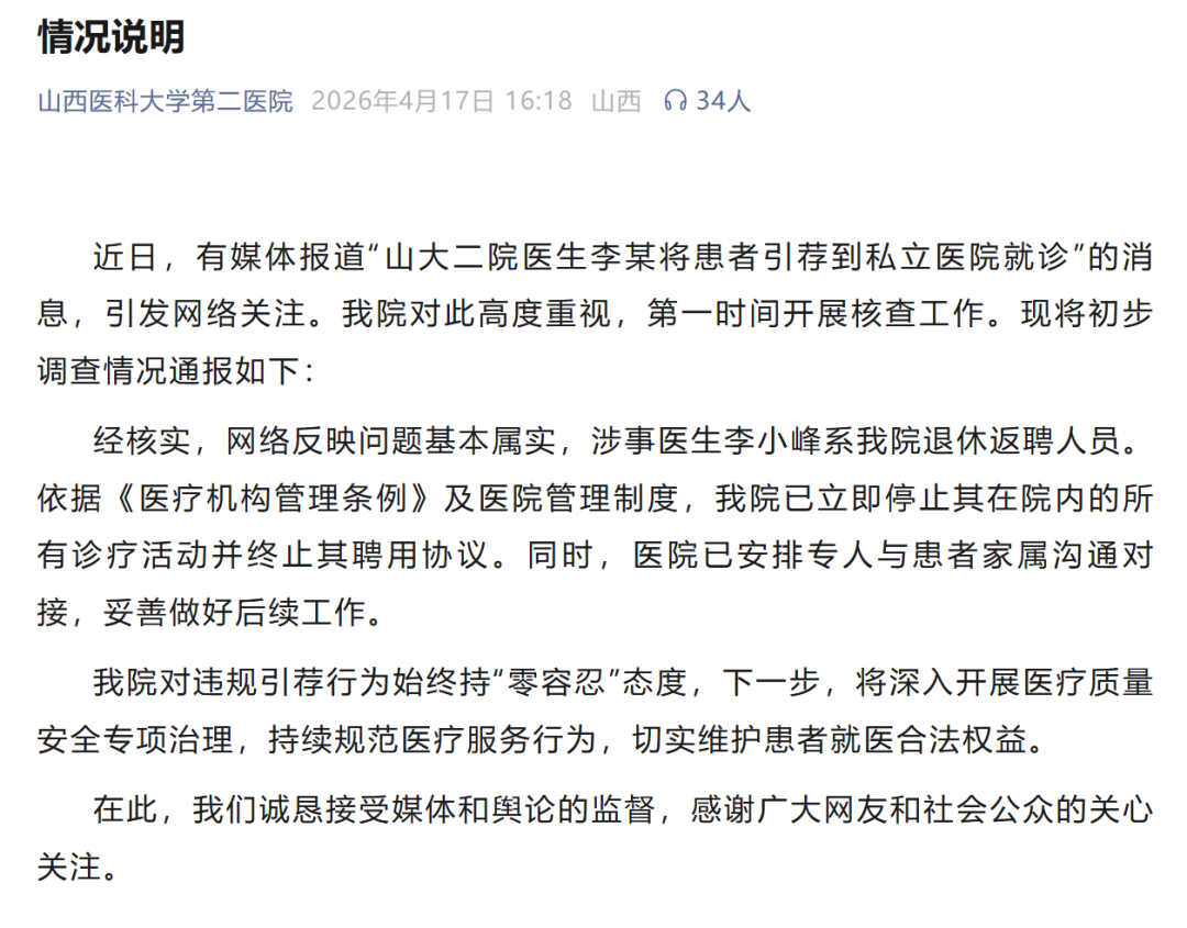 经核实,网络反映问题基本属实,涉事医生李小峰系我院退休返聘人员。依据《医疗机构管理条例》及医院管理制度,我院已立即停止其在院内的所有诊疗活动并终止其聘用协议。同时,医院已安排专人与患者家属沟通对接,妥善做好后续工作。