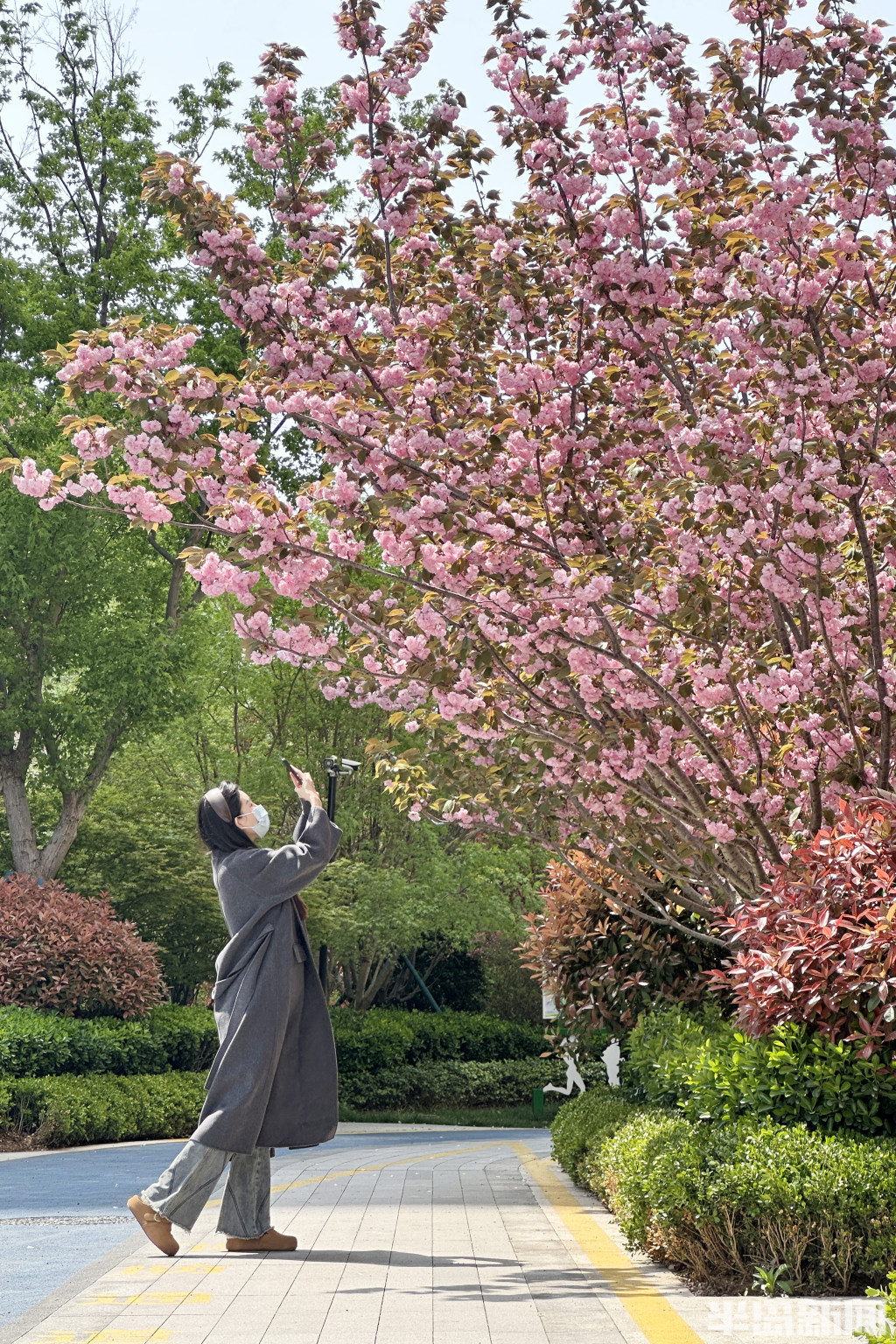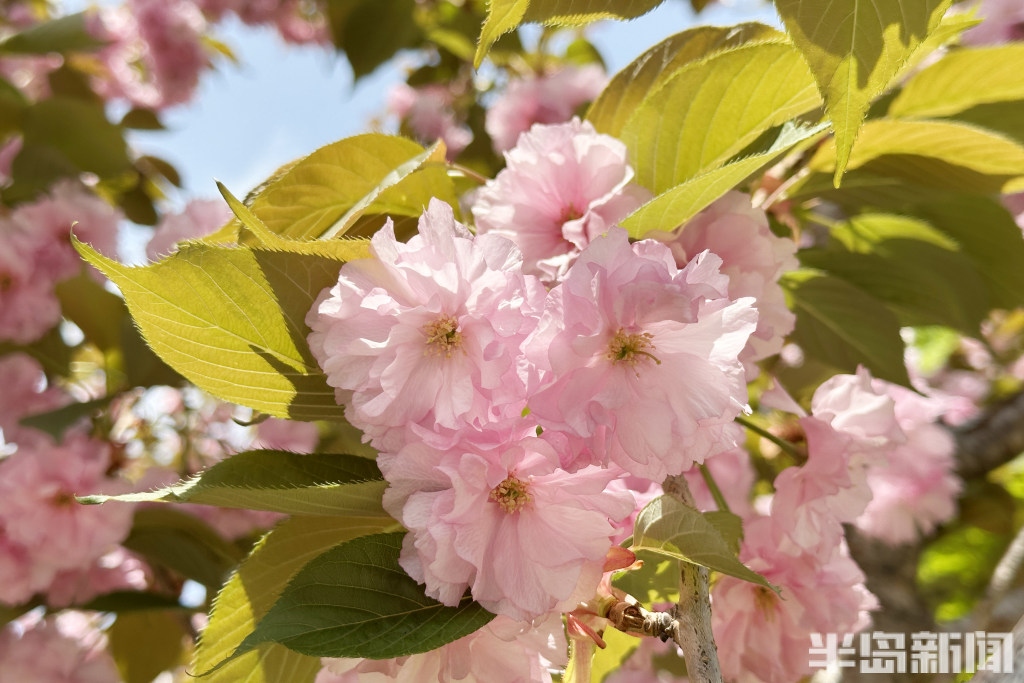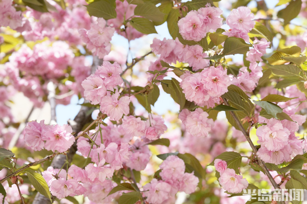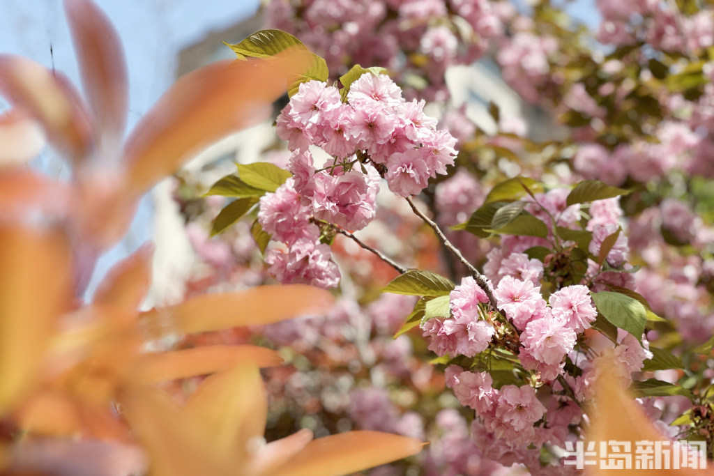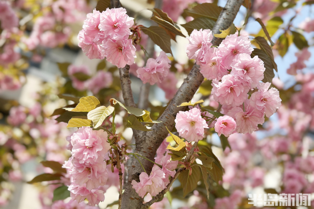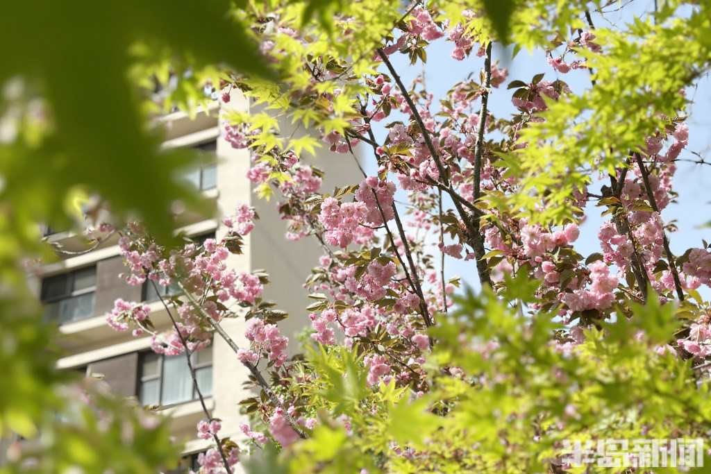 4月17日,岛城阳光明媚,宁安路附近一小区内晚樱迎来盛花期,道路两侧的樱树繁花满枝,在阳光的照射下,粉色的花瓣分外迷人,过往的路人纷纷拍照留念。据了解,重瓣晚樱是春季最晚盛开的樱花品种,以花大、重瓣、色泽艳丽著称。花期主要集中在3月底到4月中旬。正值周末,不妨趁着盎然春意,赴一场浪漫的樱花之约。(半岛全媒体记者宋泓睿)