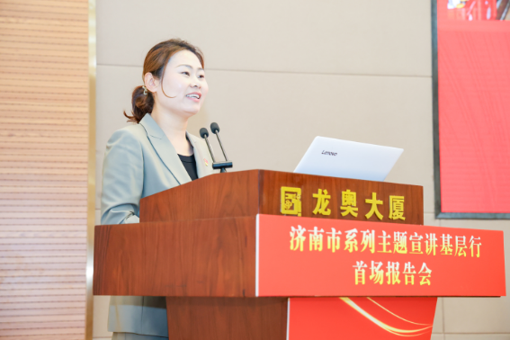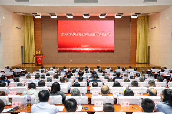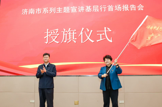 为全面贯彻党的二十届四中全会精神,4月17日上午,济南市系列主题宣讲基层行首场报告会在龙奥大厦举办。活动现场,公布了宣讲团成员名单,举行了授旗仪式,标志着济南市系列主题宣讲基层行正式拉开帷幕。
