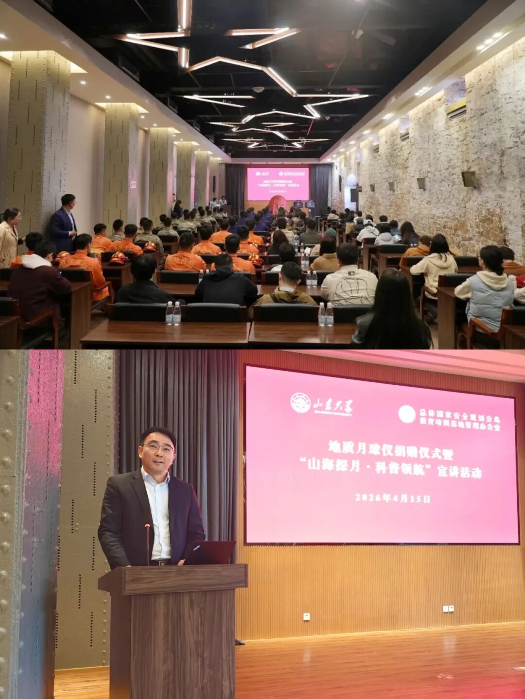 太空安全是国家安全重要组成部分。4月15日,第十一个全民国家安全教育日当天,山东大学向总体国家安全观刘公岛教育培训基地捐赠地质月球仪,并为师生代表及刘公岛驻岛某部队、消防救援站指战员,刘公岛林场森林防火救援队队员等人员开展太空安全主题科普讲座。大家还走进基地现场教学点参观学习,进一步感悟国家安全的极端重要性。