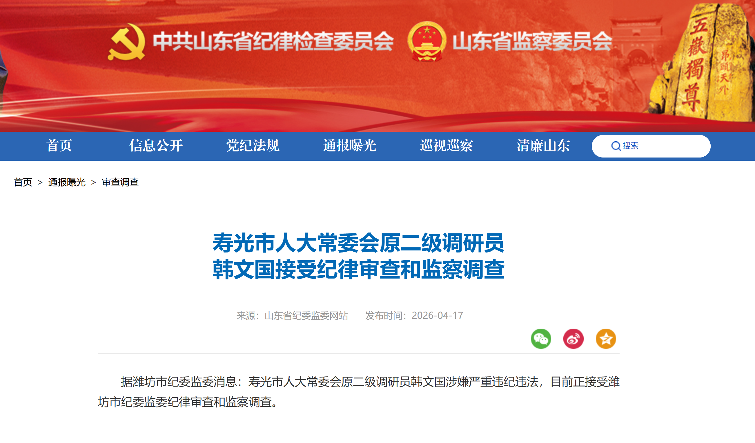山东省纪委监委网站4月17日消息,寿光市人大常委会原二级调研员韩文国涉嫌严重违纪违法,目前正接受潍坊市纪委监委纪律审查和监察调查。