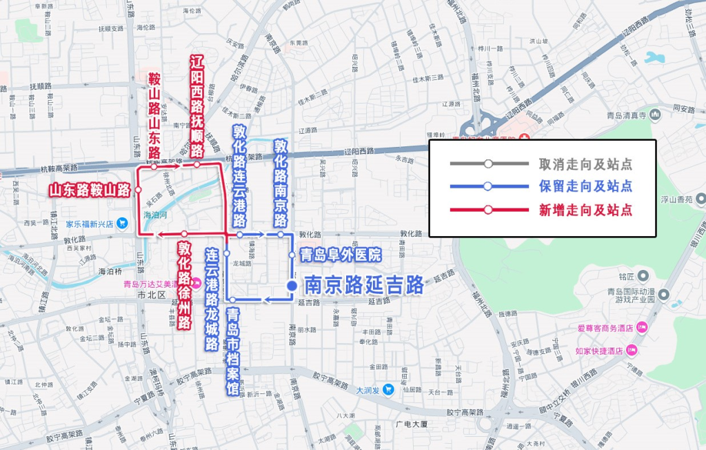 据了解,调整后线路主站仍为“南京路延吉路”,副站由原“敦化路连云港路”调整为“鞍山路山东路”,线路整体变更为“南京路延吉路—鞍山路山东路”。车辆自“南京路延吉路”始发站出发,沿南京路、延吉路、连云港路、敦化路、山东路、鞍山路、辽阳西路、连云港路、敦化路、南京路运行,最终返回“南京路延吉路”站,形成高效便民环线。