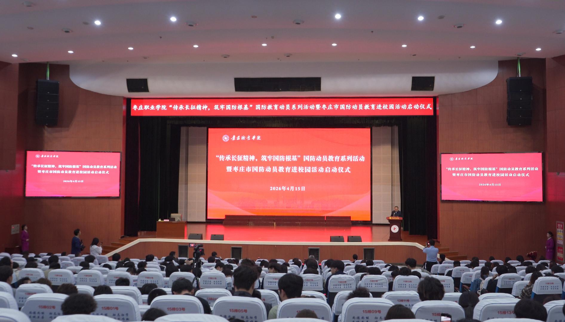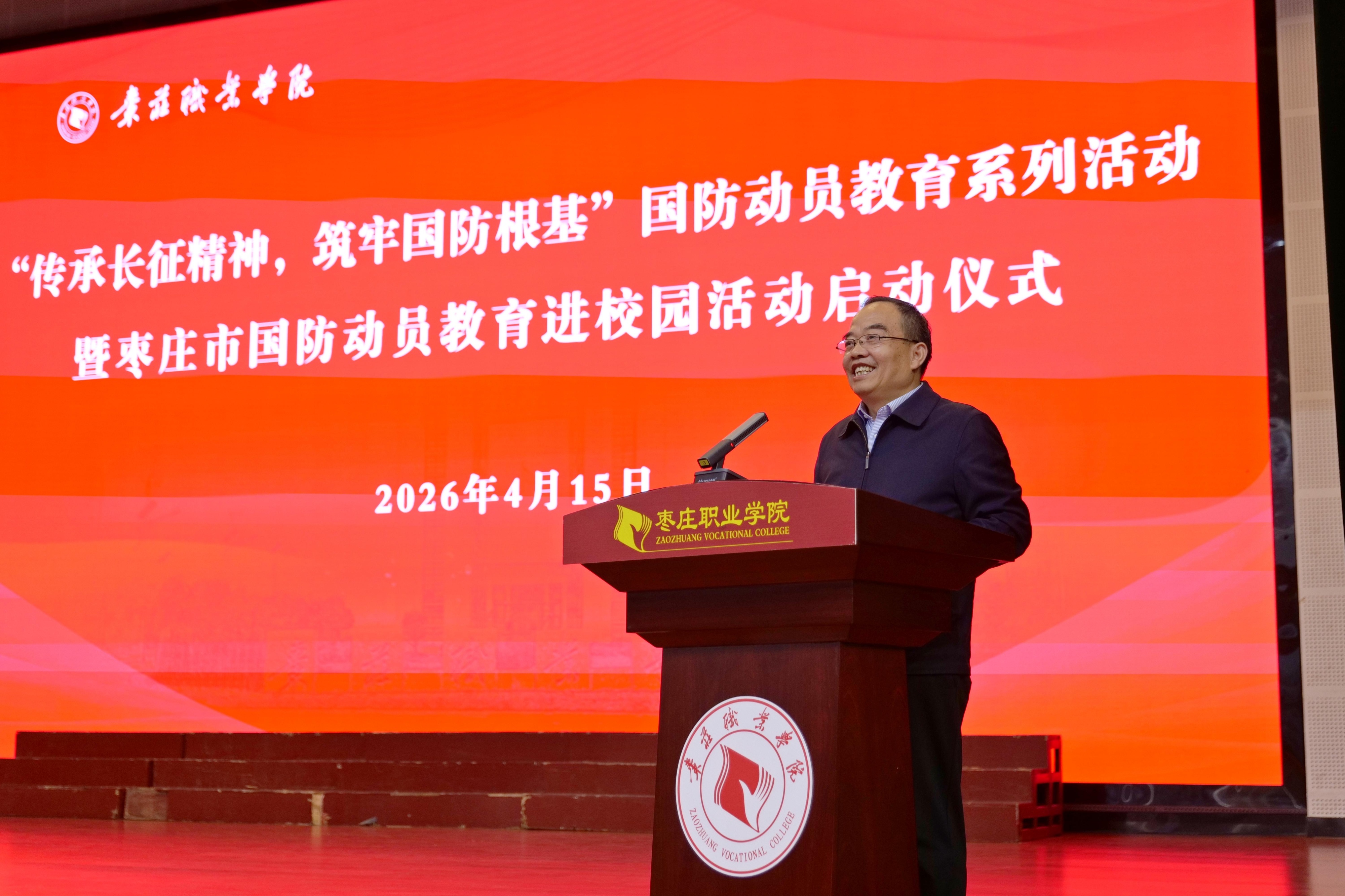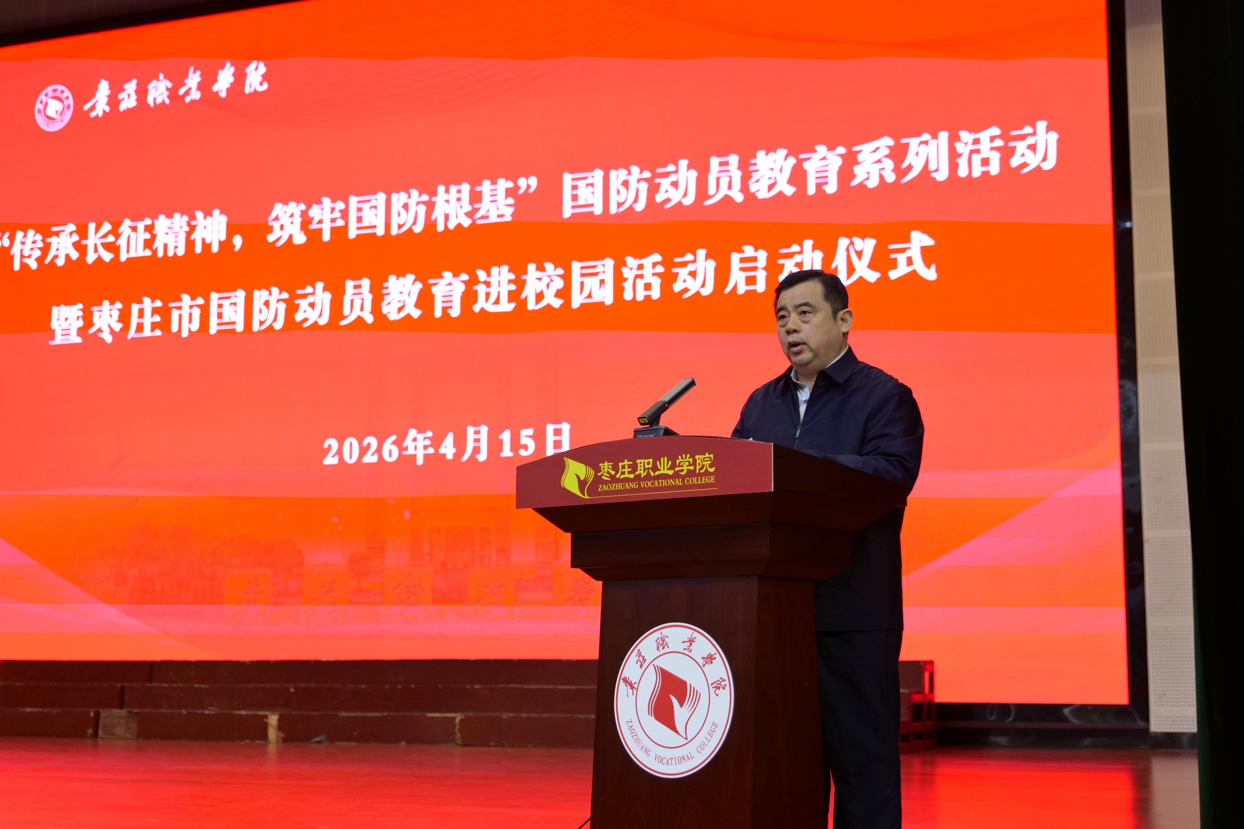 4月15日下午,枣庄职业学院举行“传承长征精神,筑牢国防根基”国防动员教育系列活动暨枣庄市国防动员教育进校园活动启动仪式。枣庄市国动办党组书记、常务副主任、市人防办主任高淦出席仪式,学院党委书记郝荣平主持仪式并讲话。市人防办原党组成员、副主任、二级调研员王继启,市国动办党组成员、副主任冯君昌和市国动办各处室负责同志,学院各系(院)负责人、学生管理负责同志、专职辅导员和学生代表等600余人参加仪式。
