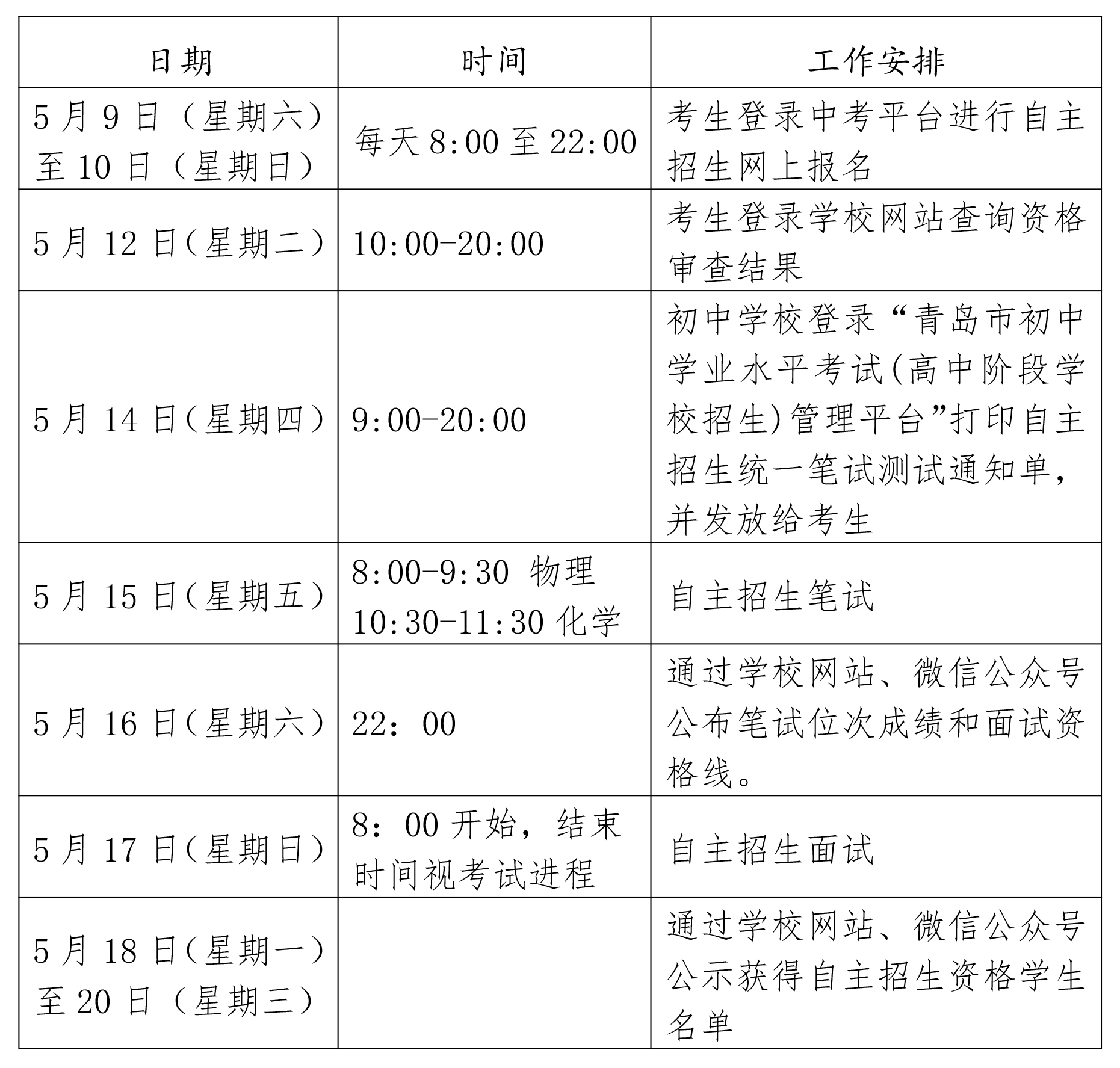 3.初中学校于5月14日(星期四)9:00-20:00 期间登录“青岛市初中学业水平考试(高中阶段学校招生)管理平台”打印自主招生统一笔试测试通知单,并发放给考生。