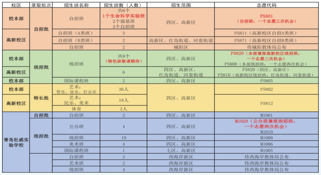 2026年青岛五十八中自主招生方案比去年有较大变化。今年,校本部计划面向四区和高新区招收一个生命科学实验班,共52人,单独编班。此外还有5个自主招生班,共260人,其中104人根据国家强基计划,单独培养。总体自招人数比去年增加62人。