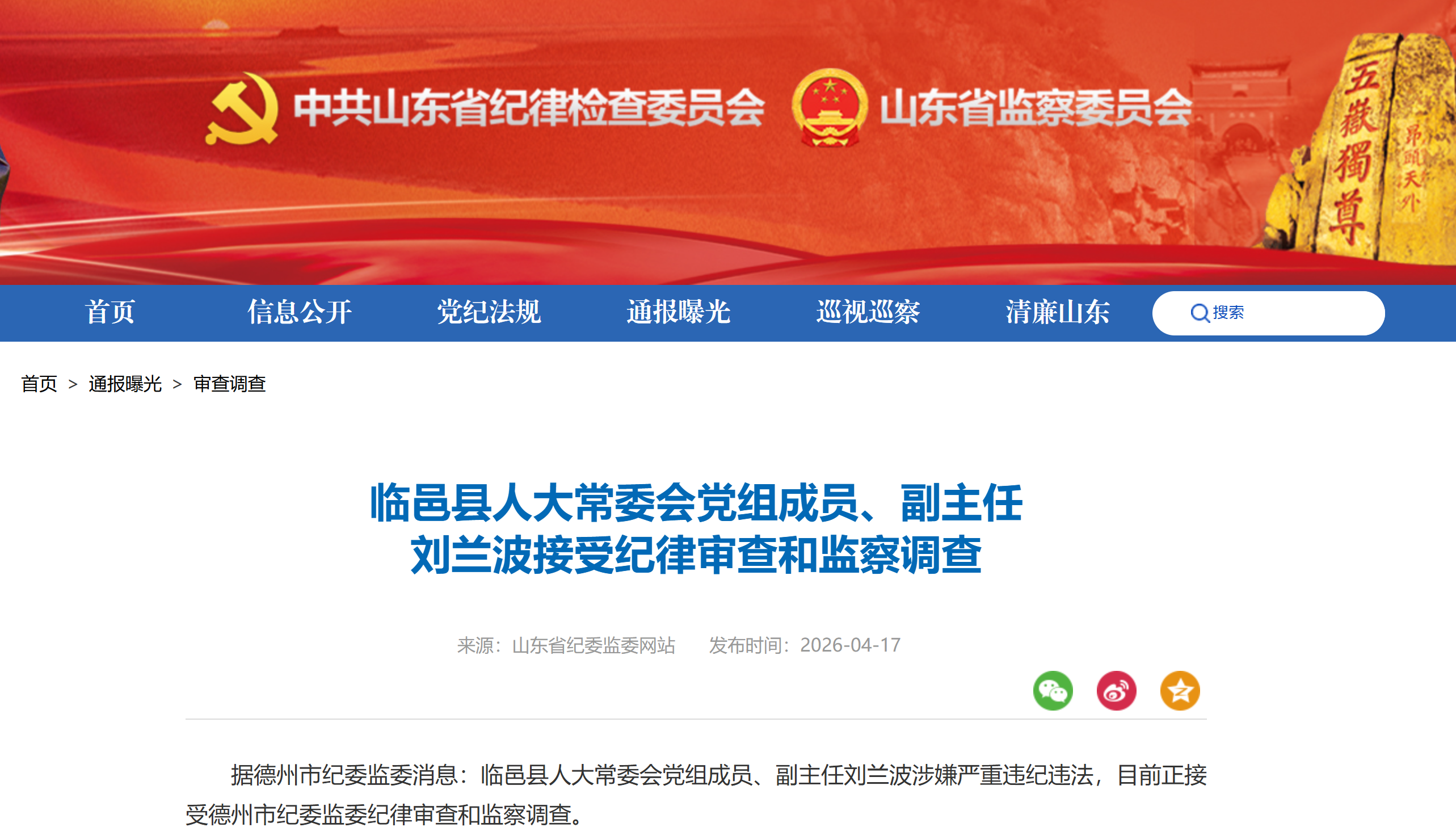 山东省纪委监委网站4月17日消息,临邑县人大常委会党组成员、副主任刘兰波涉嫌严重违纪违法,目前正接受德州市纪委监委纪律审查和监察调查。