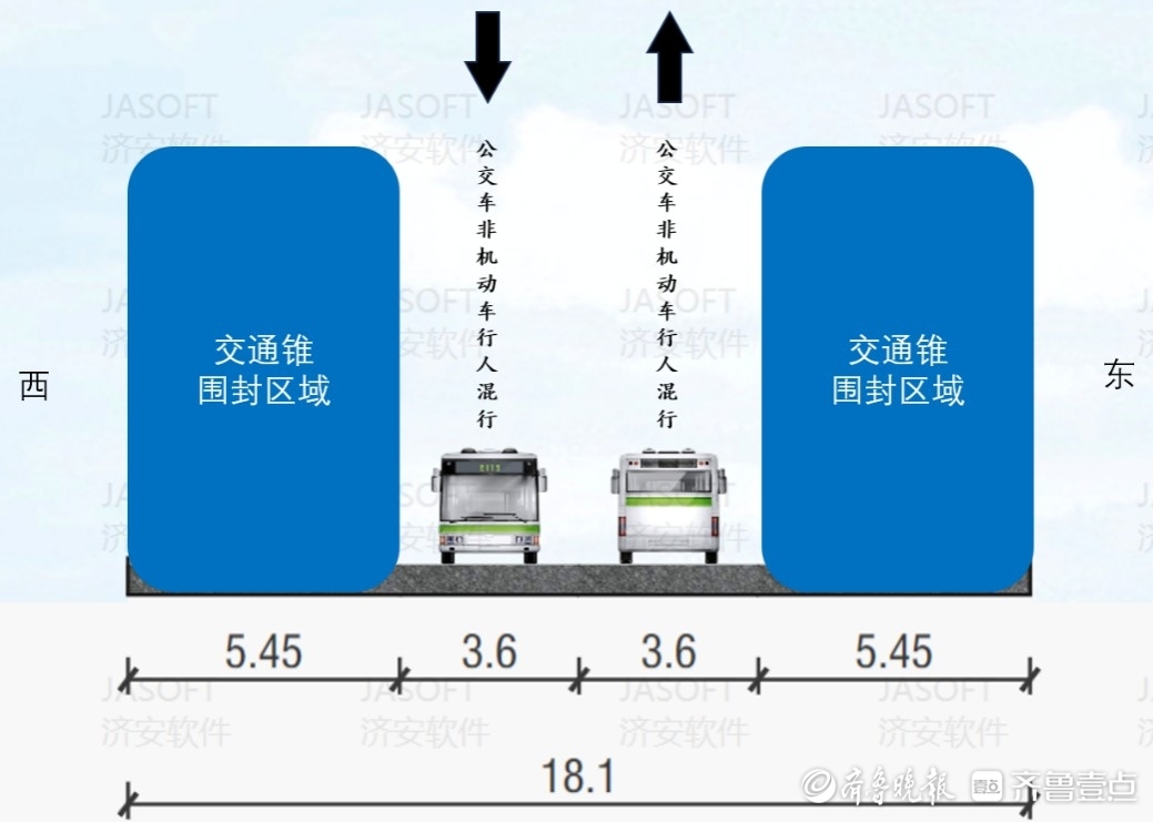 封闭大桥两侧车道,移除路侧隔离护栏,预留中间两车道,仅允许公交车、非机动车和行人双向通行。