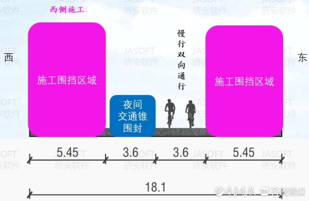 工程采用全天施工模式,分三个阶段推进施工,作业区全天围挡施工,具体通行方案如下: