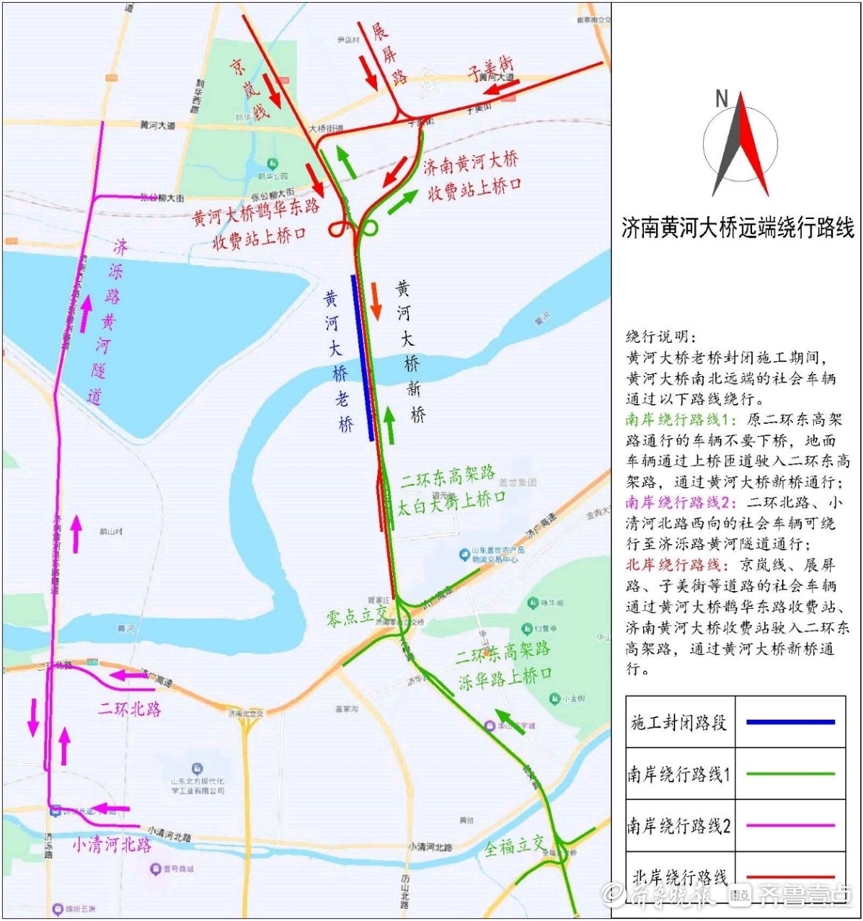 施工期间黄河大桥(老桥)禁止社会车辆通行,建议社会车辆绕行至黄河大桥(新桥)和济泺路黄河隧道通行,具体绕行路线如下: