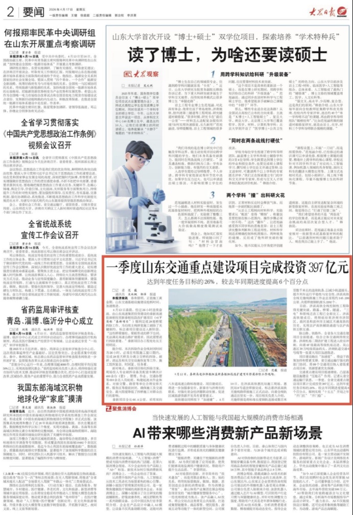 4月17日,2版要闻刊发《一季度山东交通重点建设项目完成投资397亿元》,报道泰新高速徂徕枢纽至新泰枢纽段改扩建项目顺利完成28座桥梁拆除工作,标志着项目建设迈入新阶段。详情请点击这里——