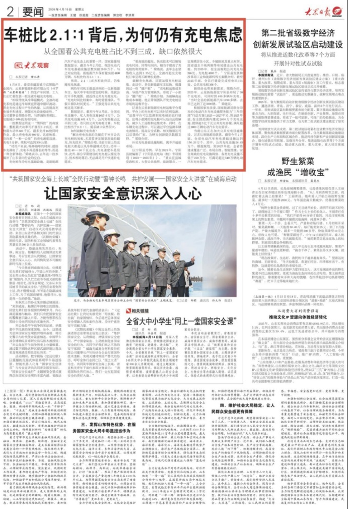 4月15日,2版要闻刊发《车桩比2.1∶1背后,为何仍有充电焦虑》,报道泰安宁阳云星新能源科技有限公司生产全液冷超充充电桩,实现充电5分钟,续航300公里。详情请点击这里——