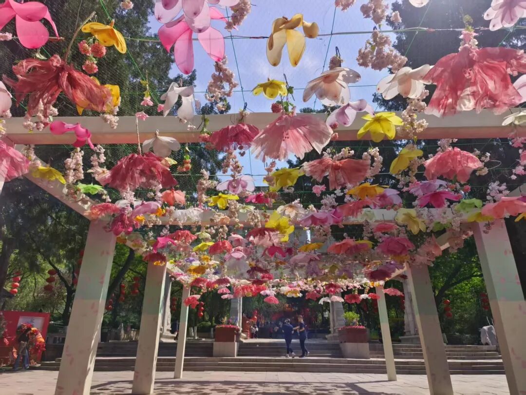 逛庙会,进门先过“绣球阵”花海通道!顺便到“马年主题灯组”“转运墙”前转上一圈,讨个好彩头,随手一拍就是国风大片。