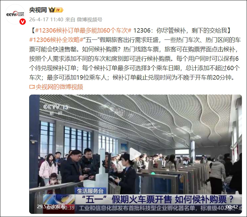 据央视网消息,“五一”假期旅客出行需求旺盛,一些热门车次、热门区间的车票可能会快速售罄。