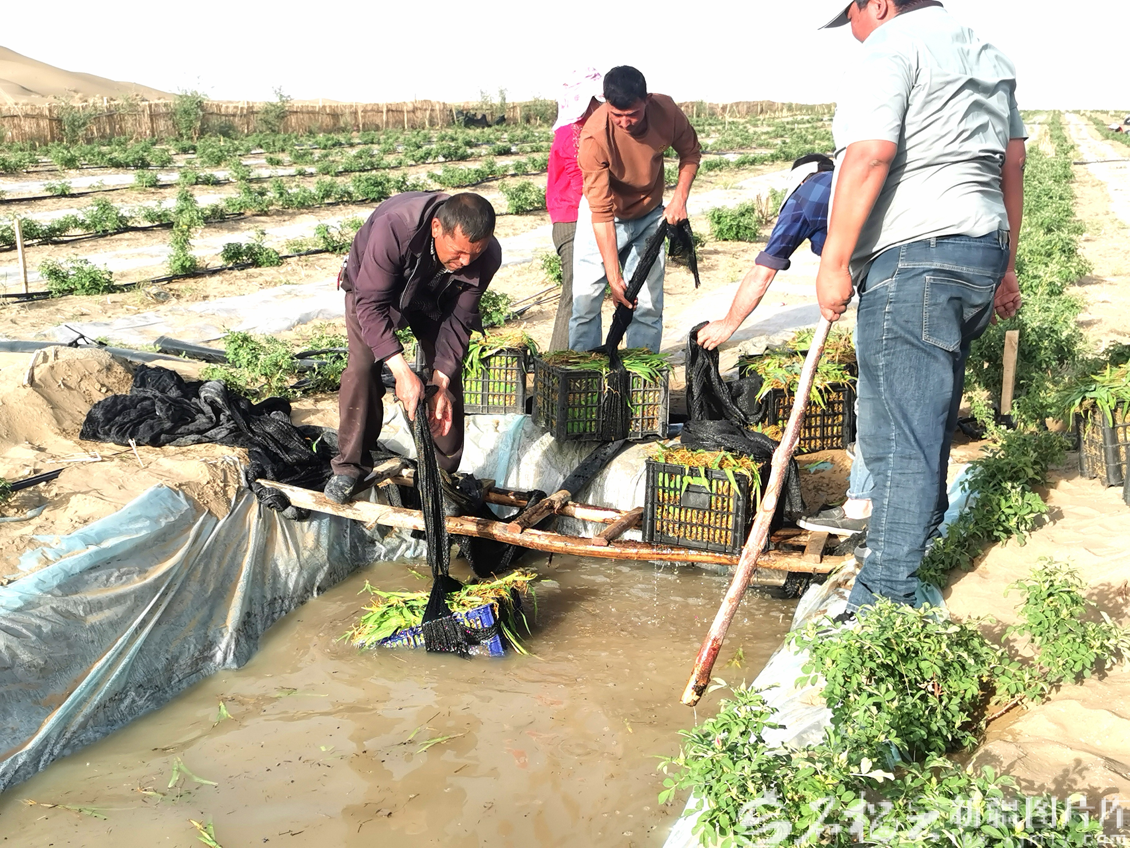 农户将射干苗浸泡在生根剂水池中,再套种在沙漠玫瑰地里。天山网-新疆日报记者 曹华摄