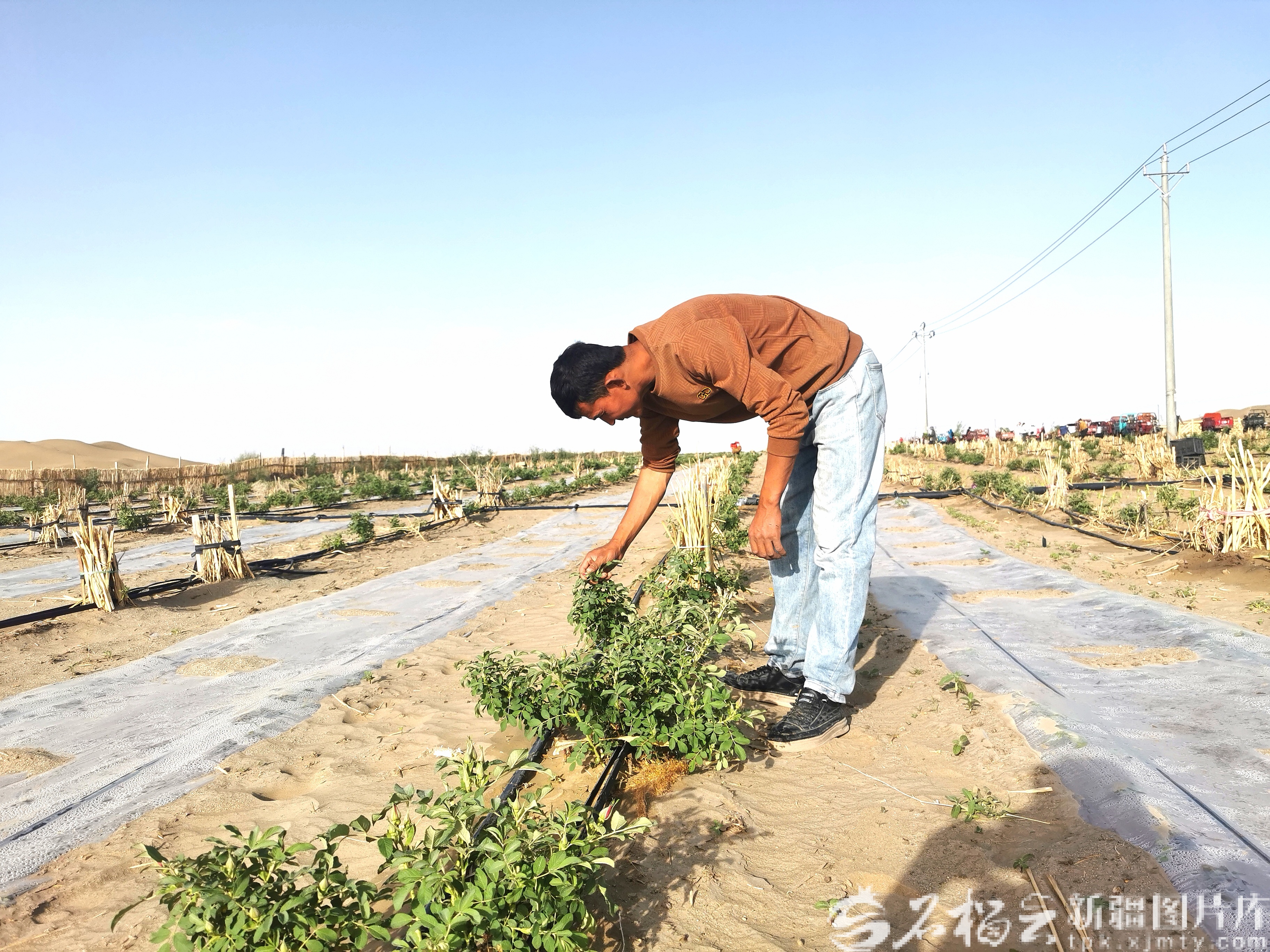沙漠的考验从未缺席。夏季的热干风是玫瑰苗存活的最大威胁。田间地头处处是忙碌的身影:黑色滴灌带如五线谱般铺展在田间,细小的水珠精准滴入植株根部;高立式沙障加紧搭建,木棍与尼龙网紧密交织,为幼苗撑起“保护伞”。种植户们提着水桶、拿着小铲,像照顾孩子般围着玫瑰苗忙碌。技术人员穿梭在田间,手把手指导:“热干风一刮,苗子容易蔫,滴灌要做到少量多次。”那一抹微弱却坚韧的绿,是死亡之海里诞生的生命,更是治沙人用汗水浇灌的希望。
