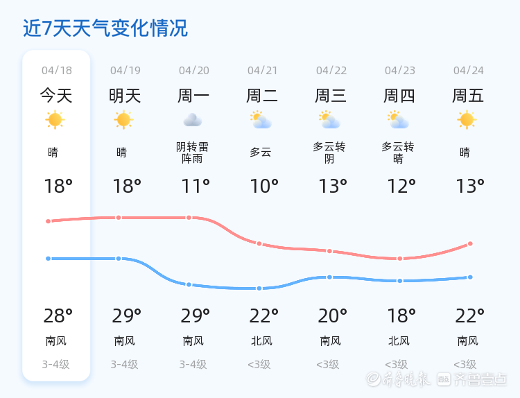 今天是4月18日,星期六,农历三月初二。济南市迎来了一天的晴好天气,气温在18℃到28℃之间,东南风2级,空气湿度为75%,PM2.5指数为92。各区整体天气状况良好,市民朋友们在享受春日暖阳的同时,也请注意适当防晒和补水。nn明天,济南市仍将保持晴朗天气,气温较今日略有上升,预计在18℃到29℃之间,南风3-4级。市民朋友们可以继续安排户外活动,但请注意随身携带轻便衣物,以应对气温变化。nn未来三天,济南市天气趋势总体平稳。周一将有阴转雷阵雨天气,气温范围为11℃到29℃,南风3-4级。周二多云,气温10℃到22℃,北风小于3级。周三多云转阴,气温13℃到20℃,南风小于3级。预计周末天气以多云为主,气温较为舒适。nn温馨提示