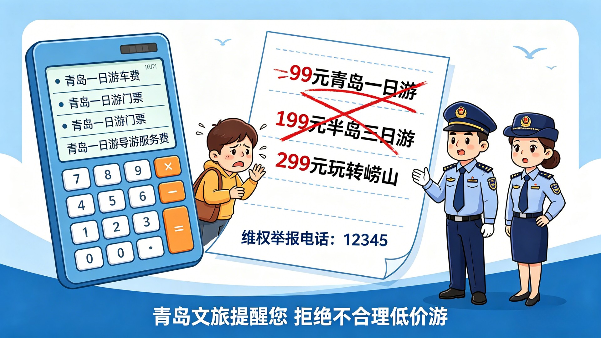 旅游图的是开心舒心,不是冒险踩坑。一分价钱一分服务,拒绝不合理低价游,守住自己的钱袋子,才能真正感受青岛的红瓦绿树、碧海蓝天。青岛市文化和旅游局将持续加大巡查执法力度,对不合理低价游、虚假宣传、强迫购物等违法违规行为零容忍、严打击、重处罚,全力守护游客的合法权益,让大家玩得放心、游得安心。