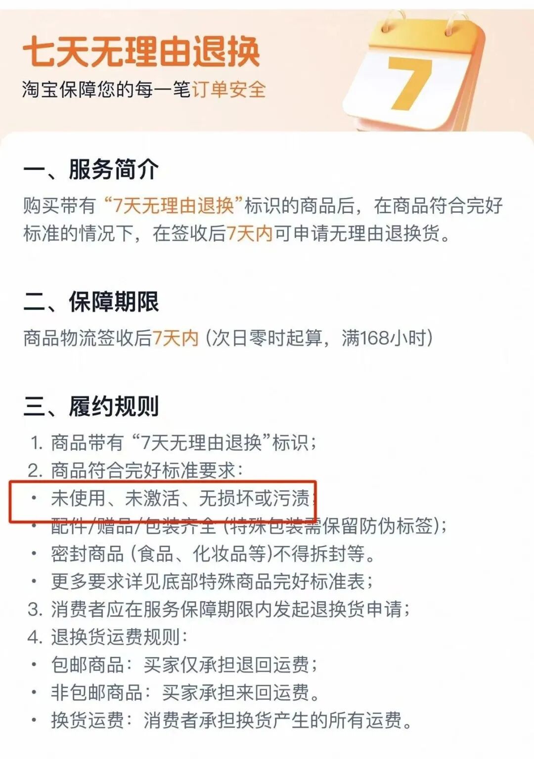 记者查阅淘宝平台的“7天无理由退换”规则,其中童装、女装类的退货条件之一为:商品无明显穿戴、无洗涤、无沾染化妆品(如口红)等痕迹。根据规则,店主收到的退货有明显使用痕迹,甚至破损的演出服,并不符合这一条件。