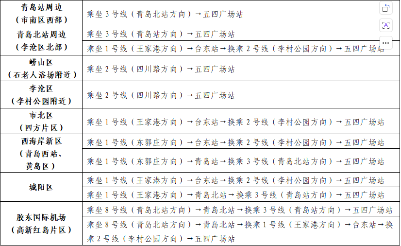 赛事当日,青岛地铁各线路运营时间与日常保持一致,不同乘车区段最早到达起点邻近车站(五四广场站、浮山所站)时间及不同区域地铁出行推荐路线见下表。赛事开始前,五四广场站2、3号线双向,浮山所站2号线双向最小行车间隔缩短至5分30秒。