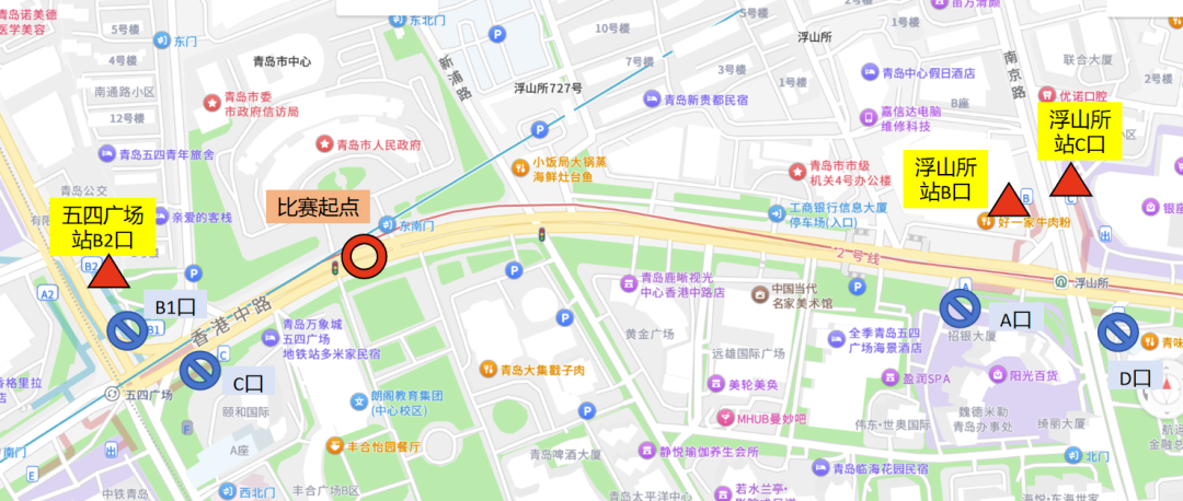 参赛选手可乘坐地铁2号线、3号线至五四广场站下车,或乘坐地铁2号线在浮山所站下车。推荐号码布以A、B开头的参赛选手于五四广场站B2出入口出站,号码布以C、D开头的参赛选手于浮山所站B出入口出站,号码布以E开头的参赛选手于浮山所站C出入口出站。