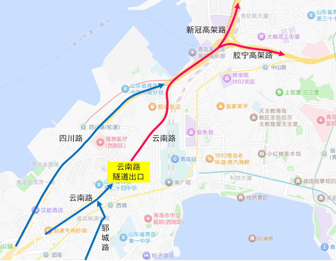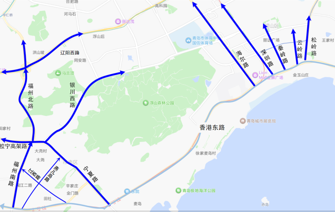 (二)由东向西行驶的社会车辆分别沿香港东路或松岭路、云岭路、秦岭路、深圳路、海尔路分流,或沿宁夏路、江西路、燕儿岛路、福州南路至银川西路、辽阳西路、胶宁高架路分流。