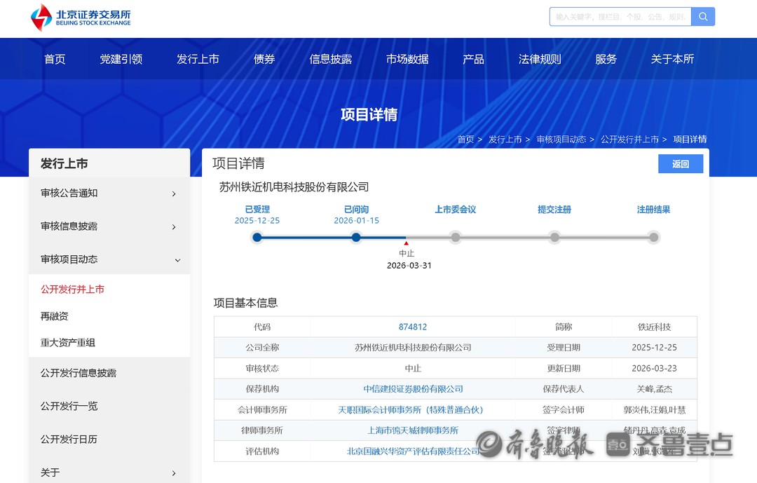 2026年3月31日,铁近科技因财务报告到期补充审计事项申请中止审核,根据《北京证券交易所向不特定合格投资者公开发行股票并上市审核规则》第五十二条,中止其公开发行股票并上市审核。