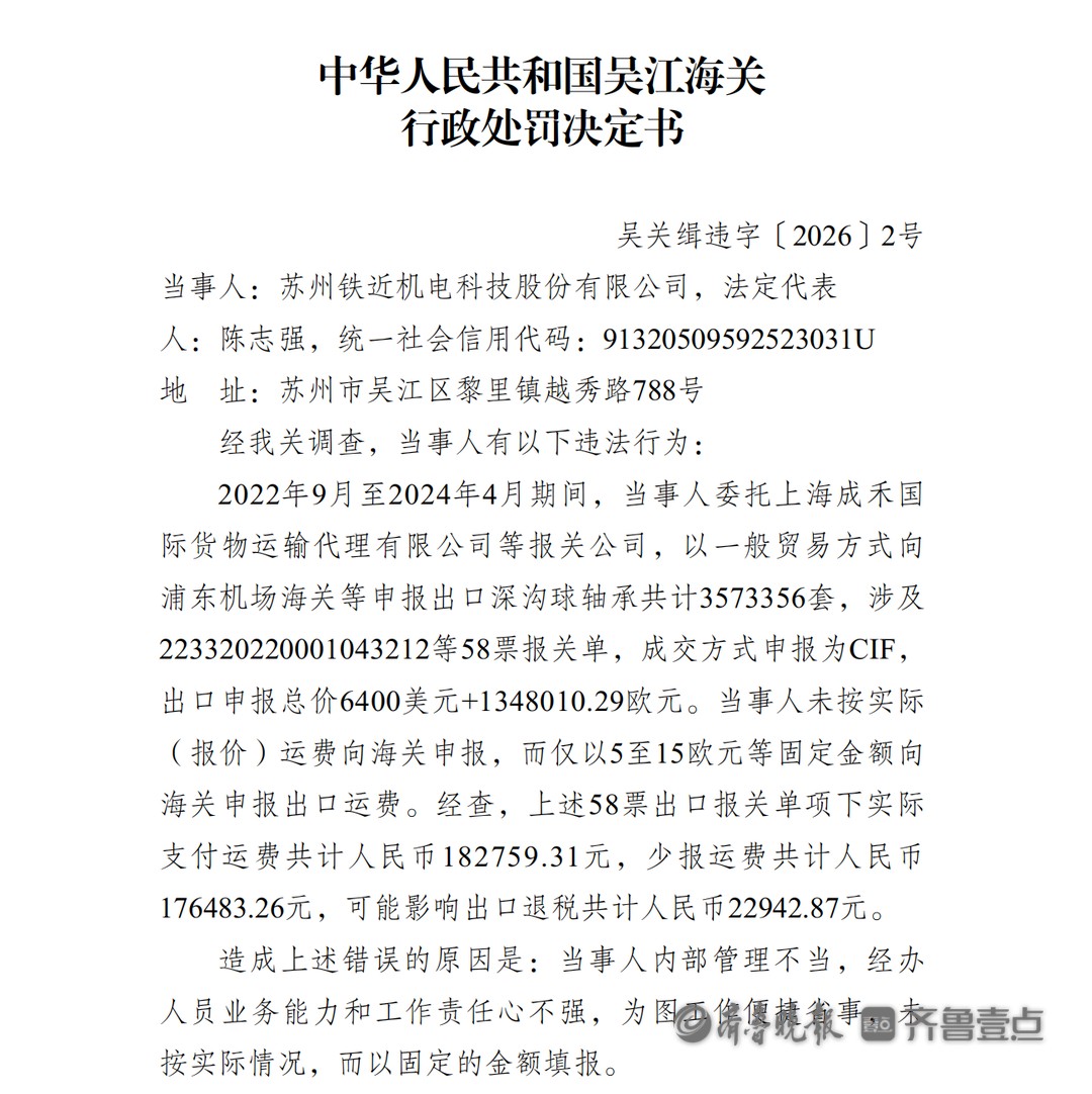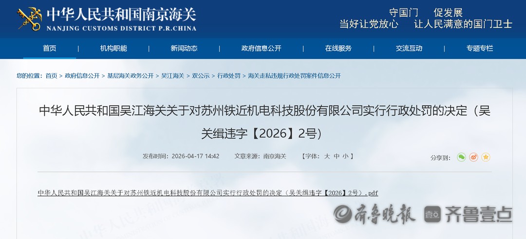 4月17日,中华人民共和国吴江海关发布关于对苏州铁近机电科技股份有限公司(下称“铁近科技”)实行行政处罚的决定(吴关缉违字【2026】2号)。