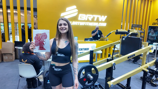 A fitness enthusiast shows Ningjin paper cutting as she tries the equipment from Shandong Brightway Fitness Equipment. [Photo/Dazhong News]