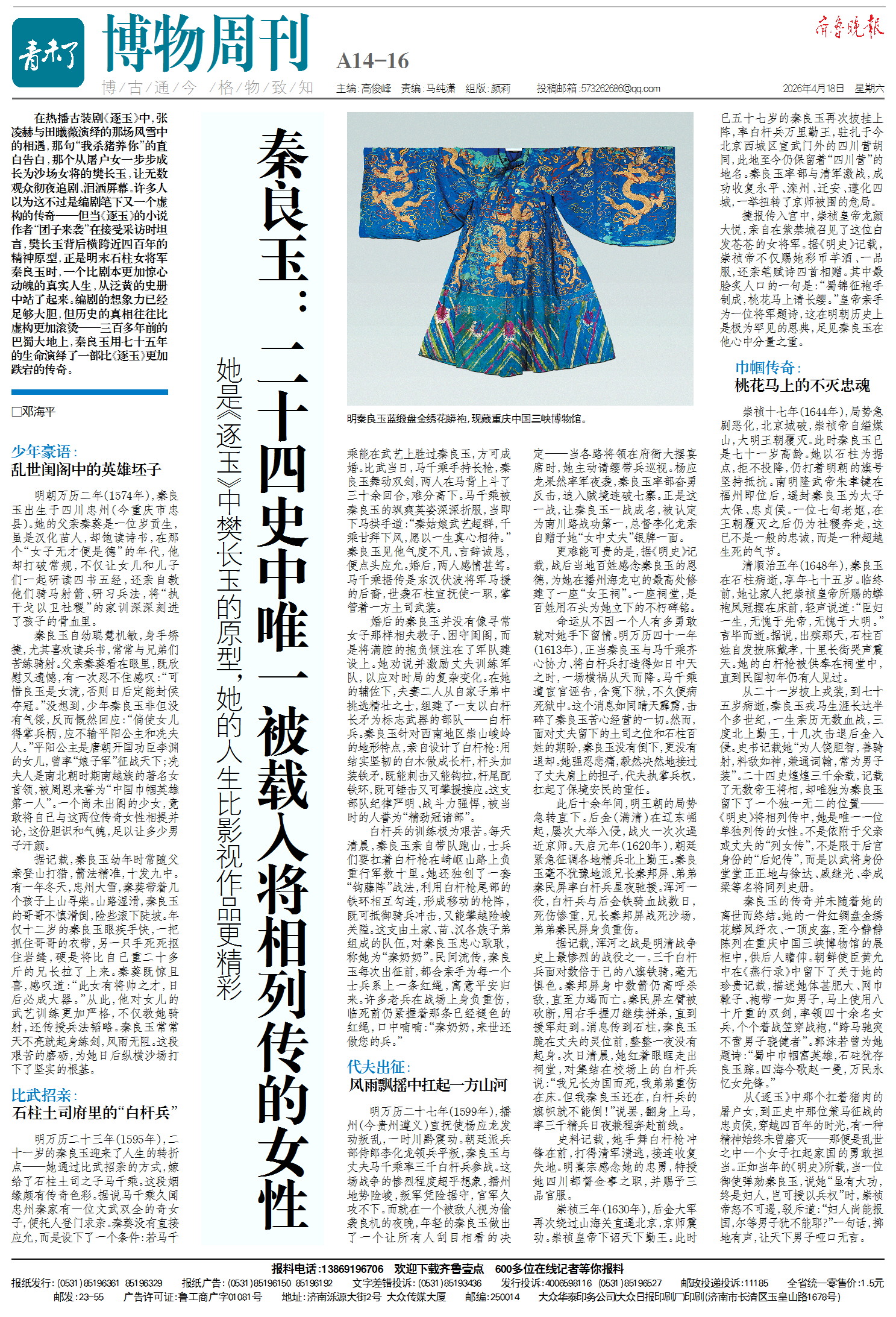 秦良玉的传奇并未随着她的离世而终结。她的一件红绸盘金绣花蟒凤纾衣、一顶皮盔,至今静静陈列在重庆中国三峡博物馆的展柜中,供后人瞻仰。朝鲜使臣黄允中在《燕行录》中留下了关于她的珍贵记载,描述她体甚肥大、网巾靴子、袍带一如男子,马上使用八十斤重的双剑,率领四十余名女兵,个个着战笠穿战袍,“跨马驰突不啻男子骁健者”。郭沫若曾为她题诗:“蜀中巾帼富英雄,石砫犹存良玉踪。四海今歌赵一曼,万民永忆女先锋。”