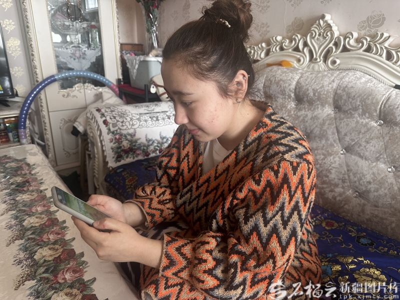 4月15日,乌鲁木齐市水磨沟区振安街街道春祥社区居民仙依旦·阿克拜尔观看《小振邻里》视频。石榴云/新疆日报记者 魏红萍摄