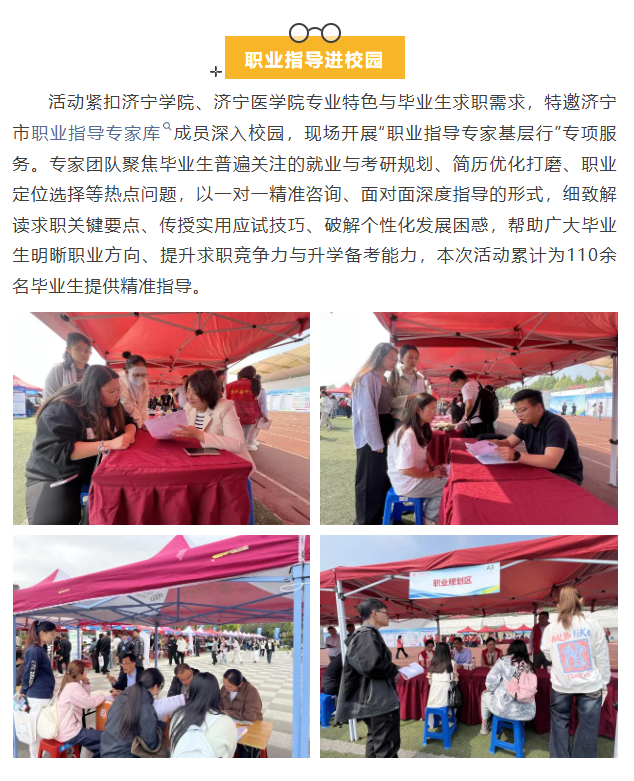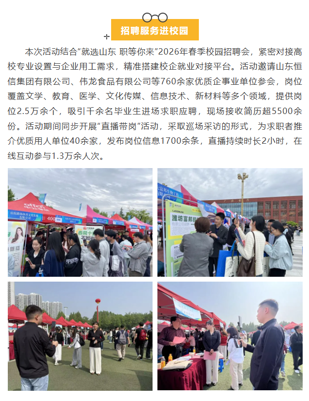 为深入贯彻落实省、市关于“就业公共服务进校园百日行动”“职引未来—2026年全国城市联合招聘高校毕业生春季专场活动”工作部署,全力促进高校毕业生高质量充分就业,4月16日—17日,济宁市人社局走进济宁学院、济宁医学院开展“就业公共服务进校园”活动,为高校毕业生提供全方位、多层次、精准化的就业创业政策支持与服务保障。