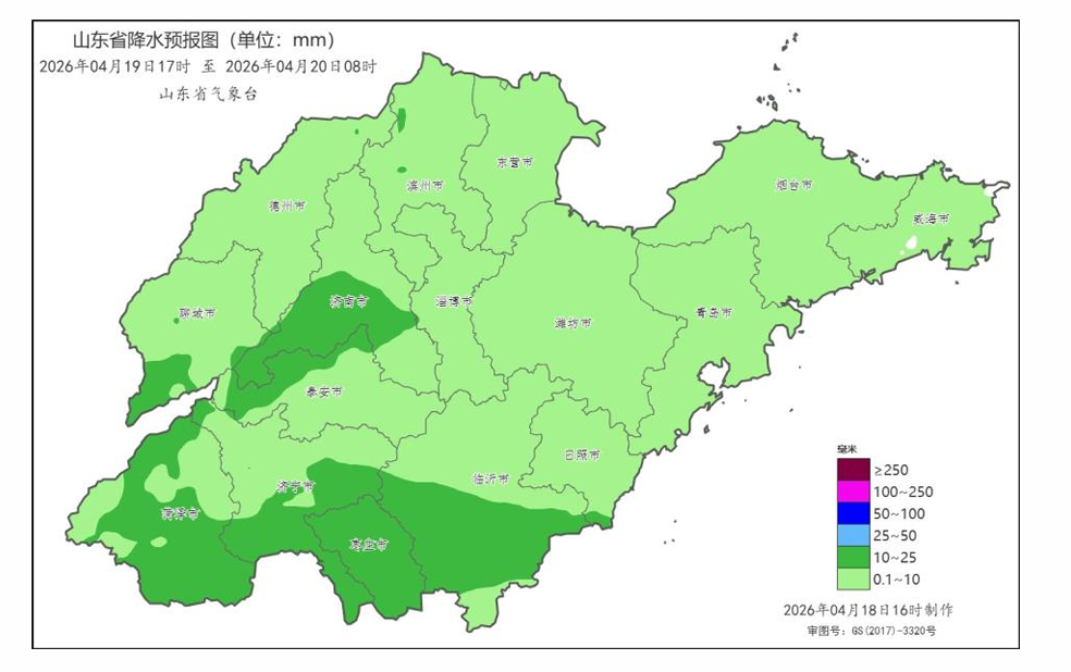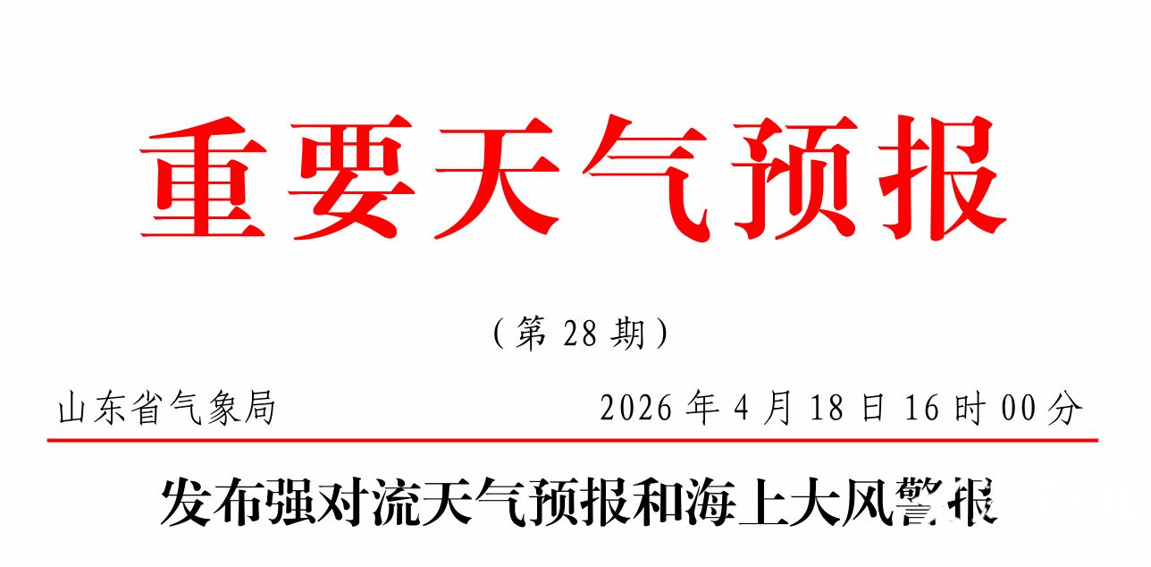 山东省气象台于4月18日16时发布强对流天气预报和海上大风警报:受高空槽影响,预计19日傍晚到夜间,我省自西向东将出现一次强对流天气过程,并伴有雷电和7~9级局部10级以上的雷雨阵风。全省大部地区有小雨,鲁南和鲁中的部分地区有中雨,累积平均降水量3~8毫米,局部降水量可达20毫米以上。