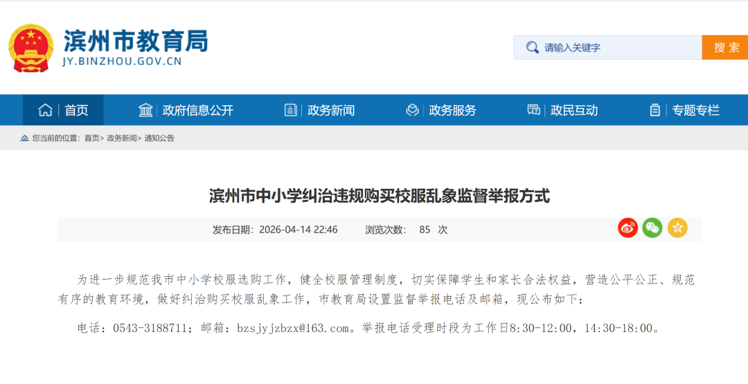 纠治违规购买校服乱象!滨州市教育局公布举报方式