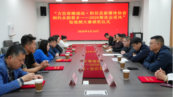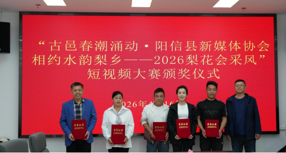 春风送暖,梨香四溢。4月16日,“古邑春潮涌动·阳信县新媒体协会相约水韵梨乡——2026梨花会采风”短视频大赛颁奖仪式在阳信县新时代文明实践中心举行。县委宣传部分管日常工作的副部长、县委网信办主任常明明,县新媒体协会会长齐晓光、秘书长孙秀利及协会会员代表参加活动。